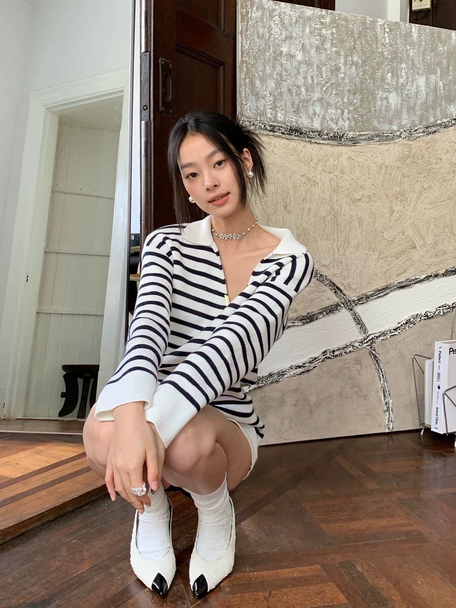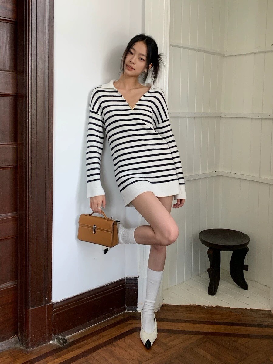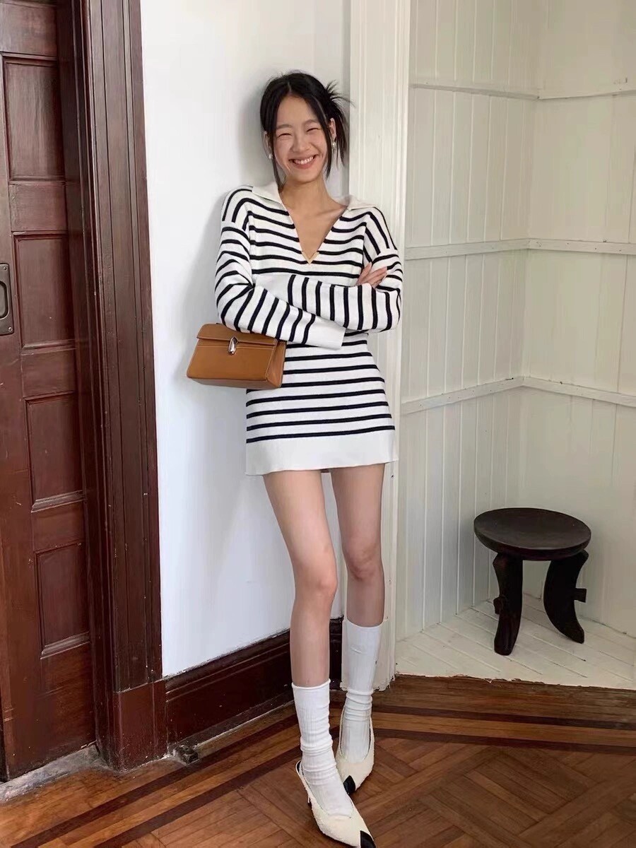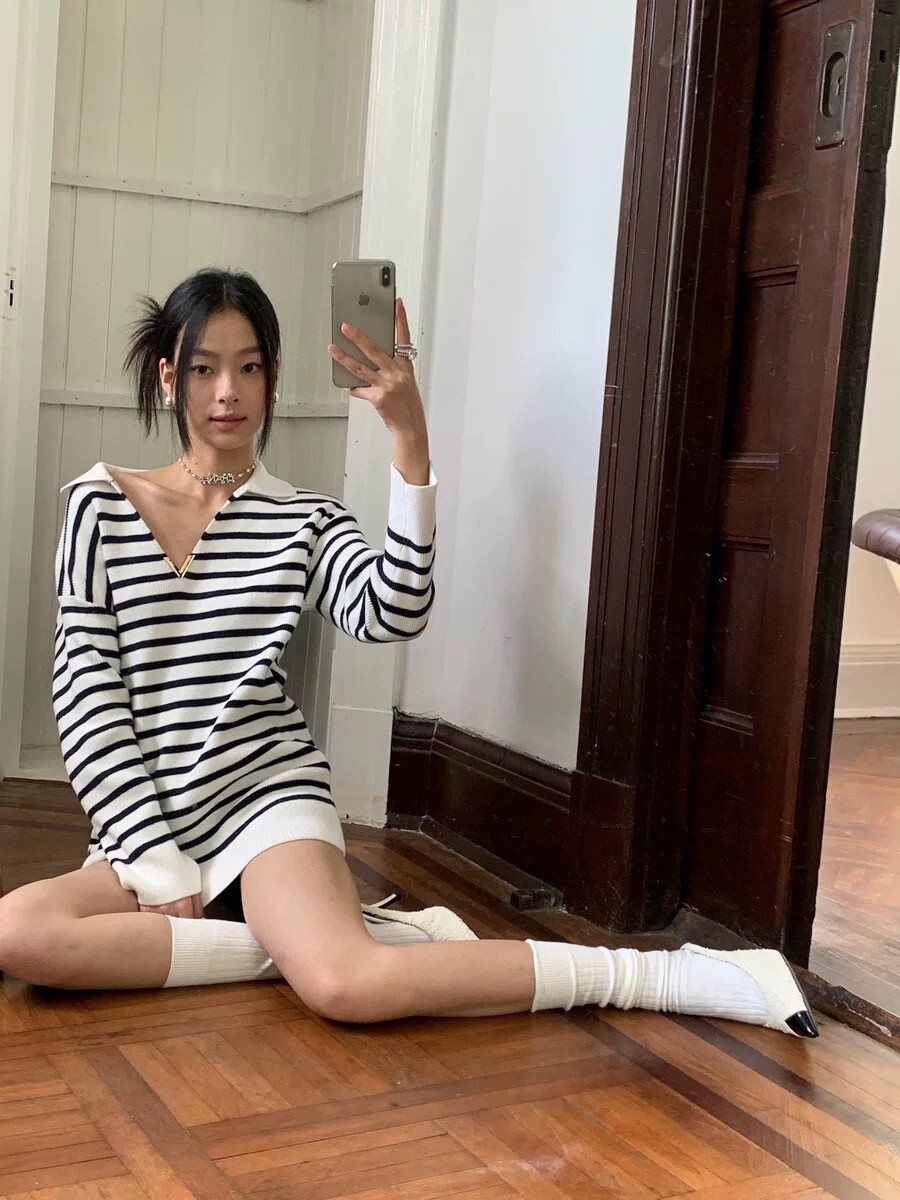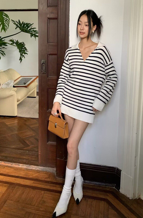 이중겹면 염색 부드러우면서도 스타일리쉬한 9바늘 머신 칼라가 깊어서 쇄골이 드러납니다. 고혹적인 분위기를 풍기는 스트라이프 니트 드레스가 너무 예쁩니다. 네이비 스트라이프는 우아하고 섹시한 느낌을 줍니다 심플한 컬러 매칭이지만 아주 고급스럽습니다.오랫동안 지속되는 클래식 초가을부터 시작하는 것이 좋습니다