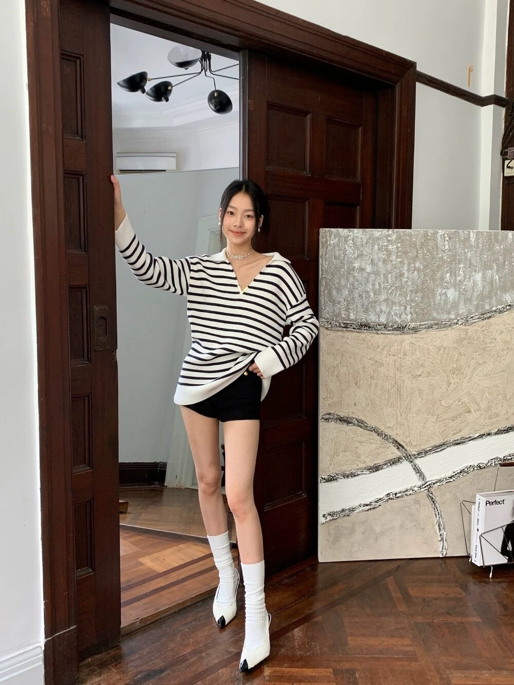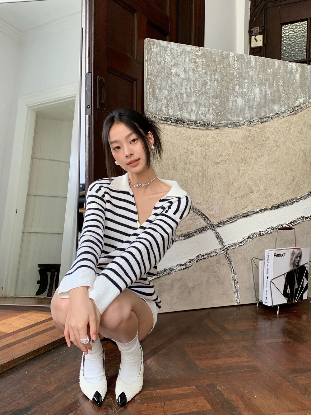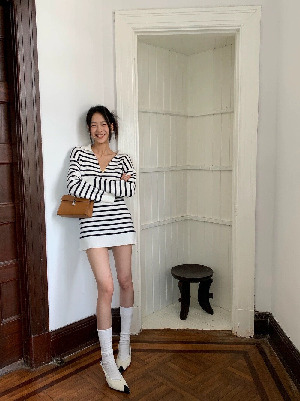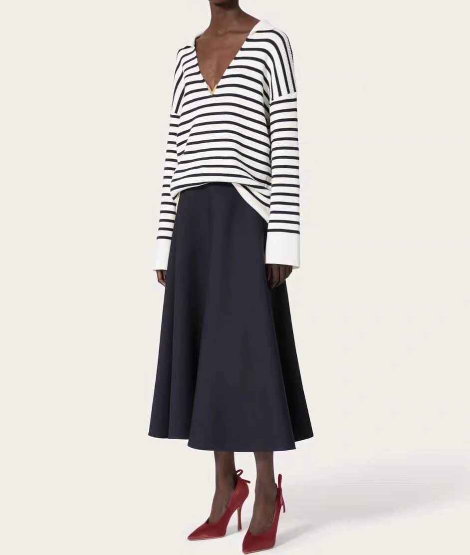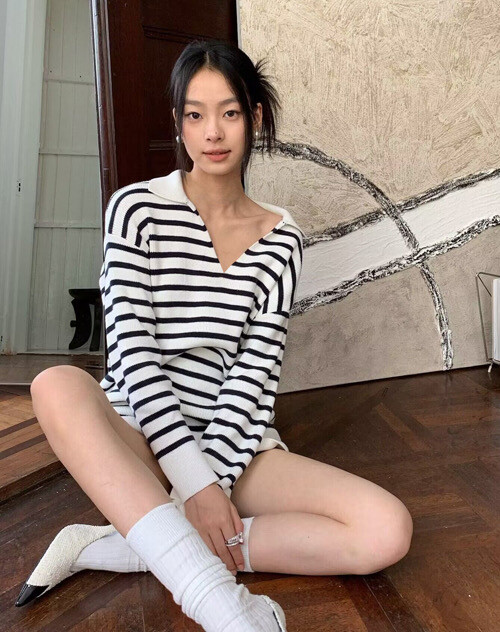 이중겹면 염색 부드러우면서도 스타일리쉬한 9바늘 머신 칼라가 깊어서 쇄골이 드러납니다. 고혹적인 분위기를 풍기는 스트라이프 니트 드레스가 너무 예쁩니다. 네이비 스트라이프는 우아하고 섹시한 느낌을 줍니다 심플한 컬러 매칭이지만 아주 고급스럽습니다.오랫동안 지속되는 클래식 초가을부터 시작하는 것이 좋습니다