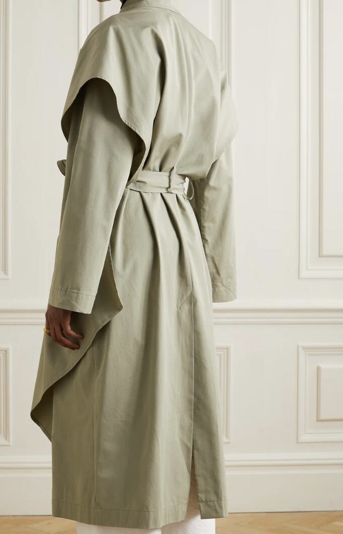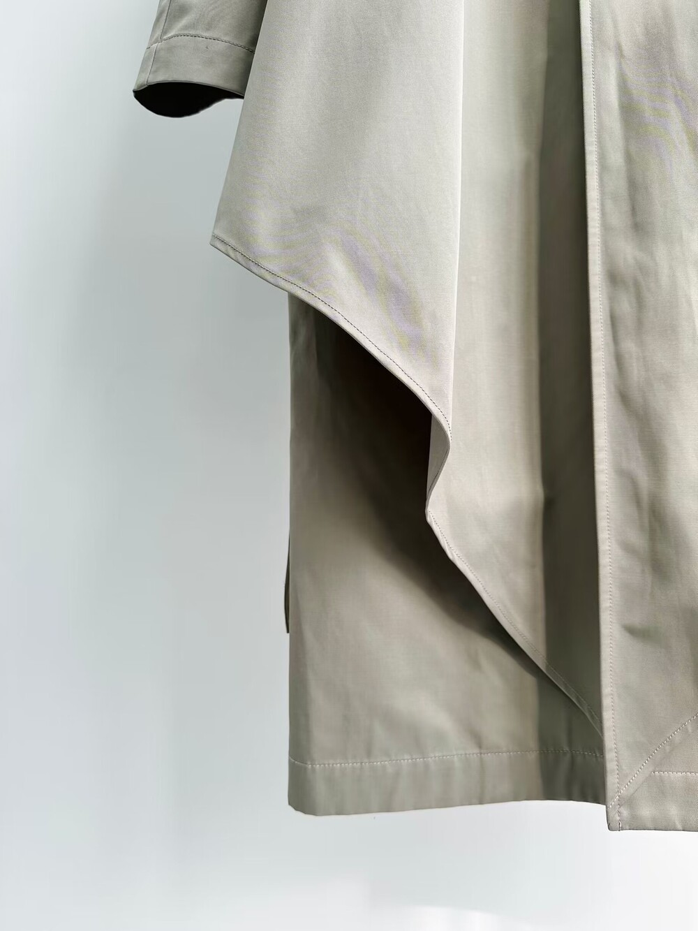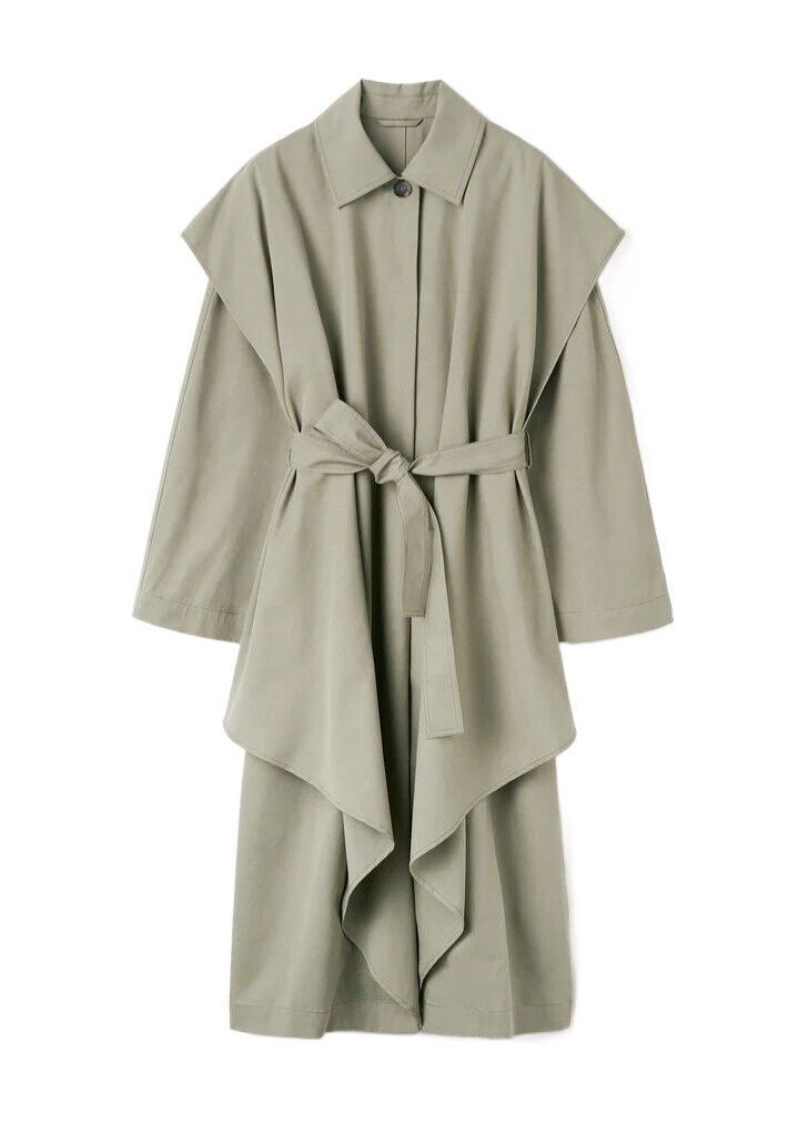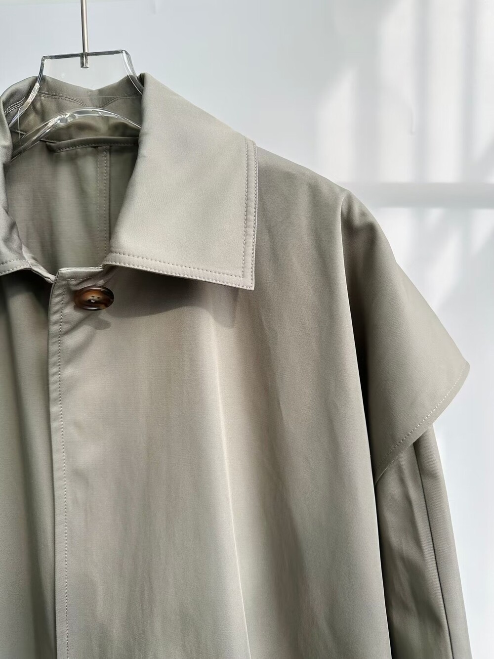 오가닉 코튼과 큐프로 혼방 트윌 트렌치코트. 레이어드 구조 스프레드 칼라 앞면 오픈형 버튼 여밈 벨트 루프 및 탈부착 가능한 셀프 타이 벨트 웰트 포켓 드롭 숄더 뒷면 스톰 플랩 뒷면 밑단 중앙 벤트 안감 없습니다