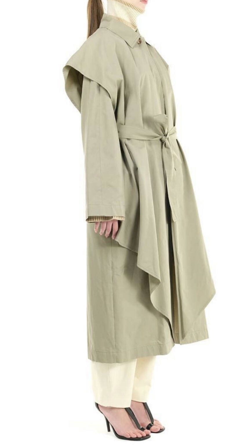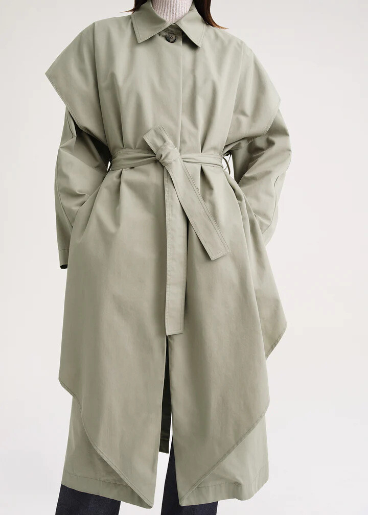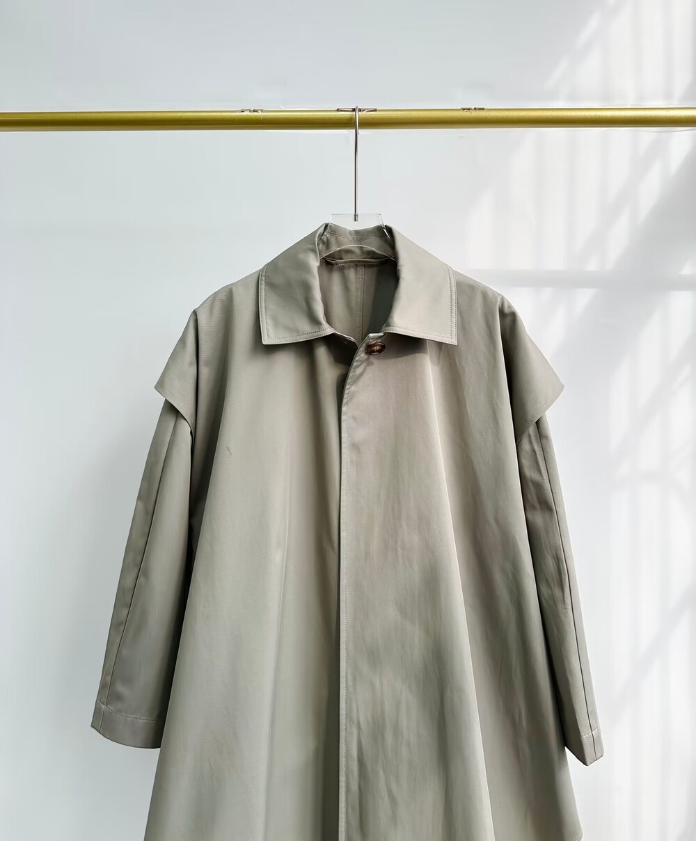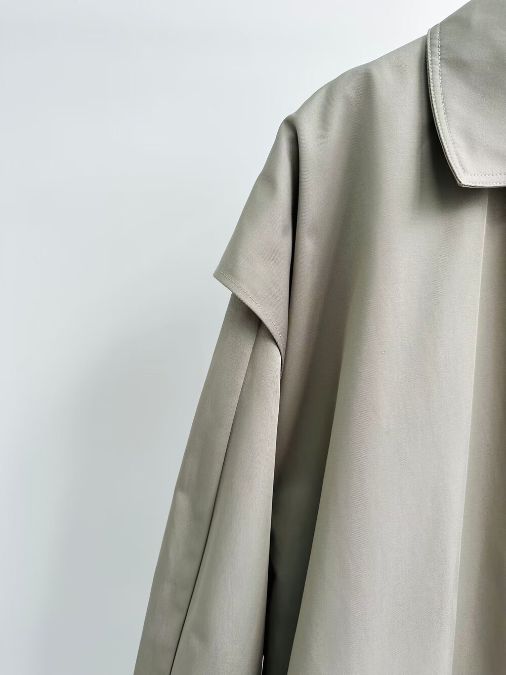 오가닉 코튼과 큐프로 혼방 트윌 트렌치코트. 레이어드 구조 스프레드 칼라 앞면 오픈형 버튼 여밈 벨트 루프 및 탈부착 가능한 셀프 타이 벨트 웰트 포켓 드롭 숄더 뒷면 스톰 플랩 뒷면 밑단 중앙 벤트 안감 없습니다
