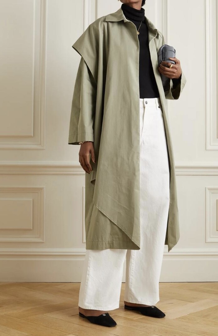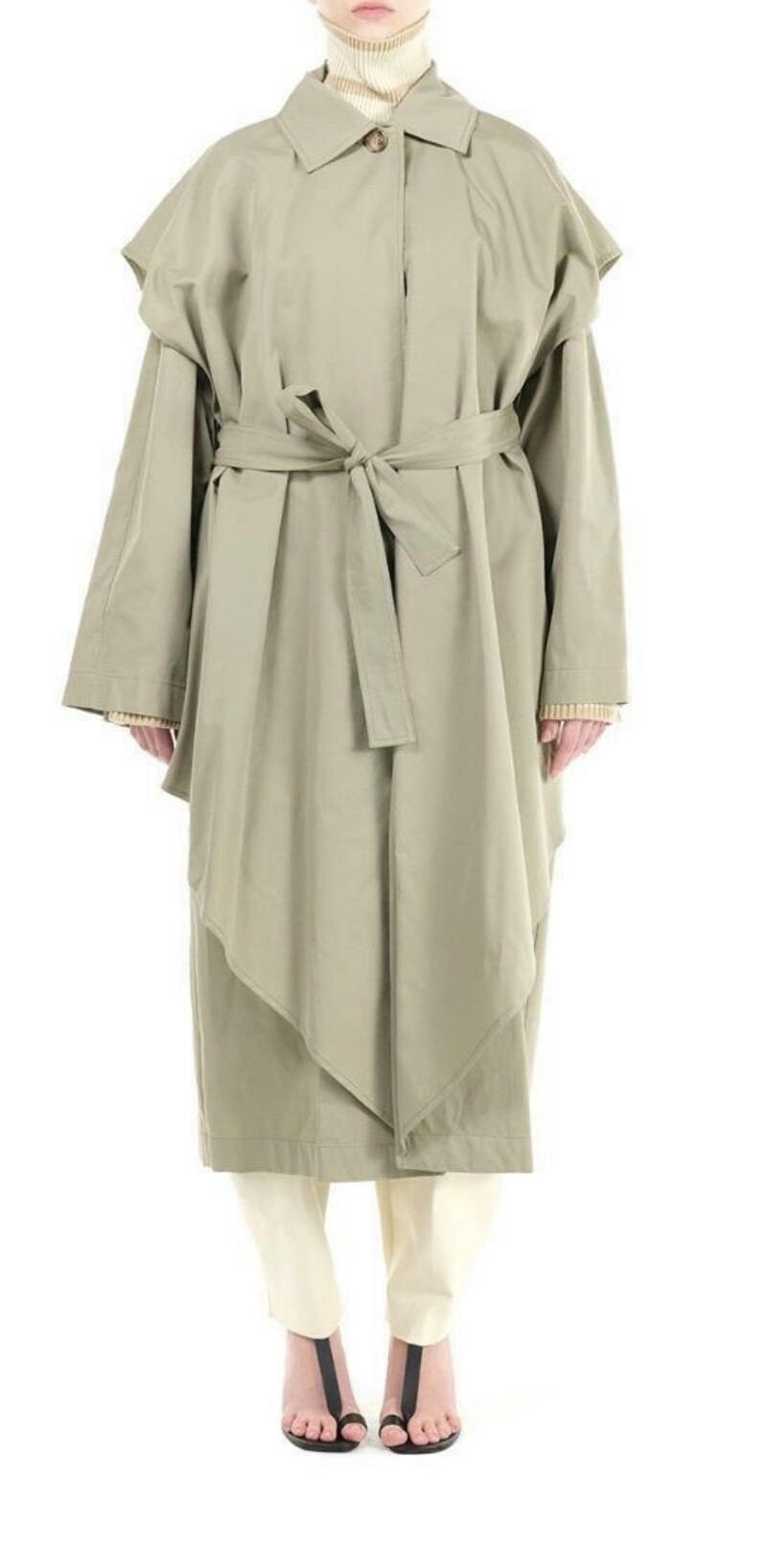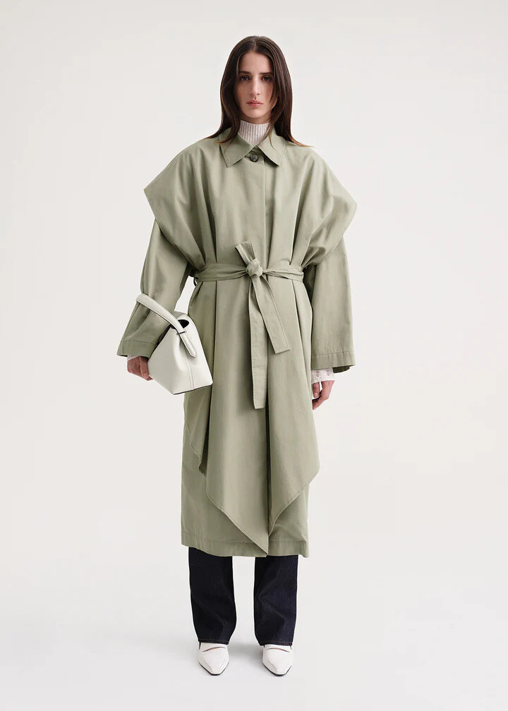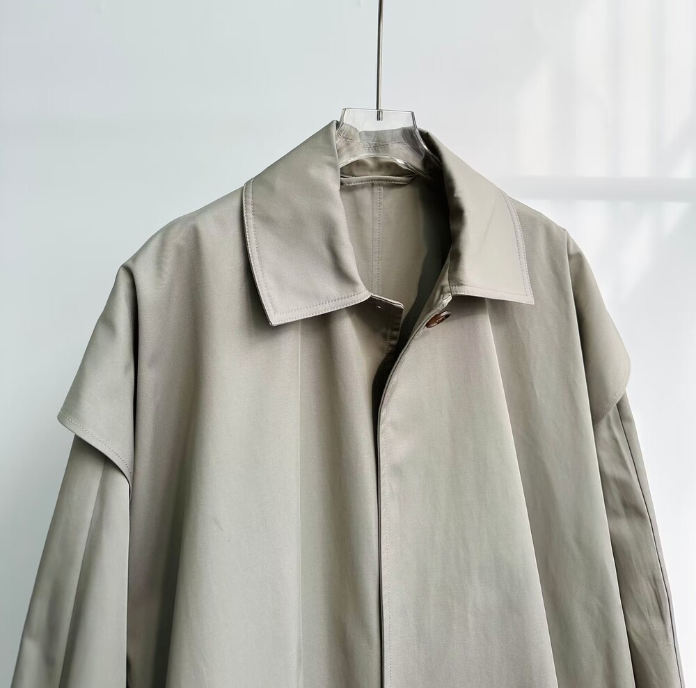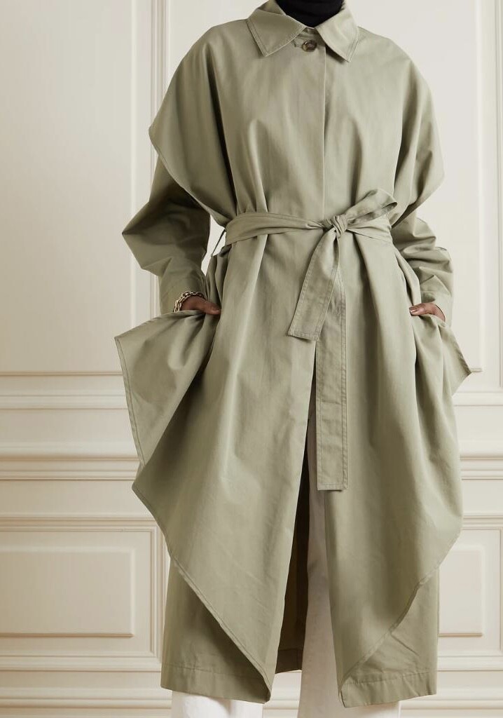 오가닉 코튼과 큐프로 혼방 트윌 트렌치코트. 레이어드 구조 스프레드 칼라 앞면 오픈형 버튼 여밈 벨트 루프 및 탈부착 가능한 셀프 타이 벨트 웰트 포켓 드롭 숄더 뒷면 스톰 플랩 뒷면 밑단 중앙 벤트 안감 없습니다