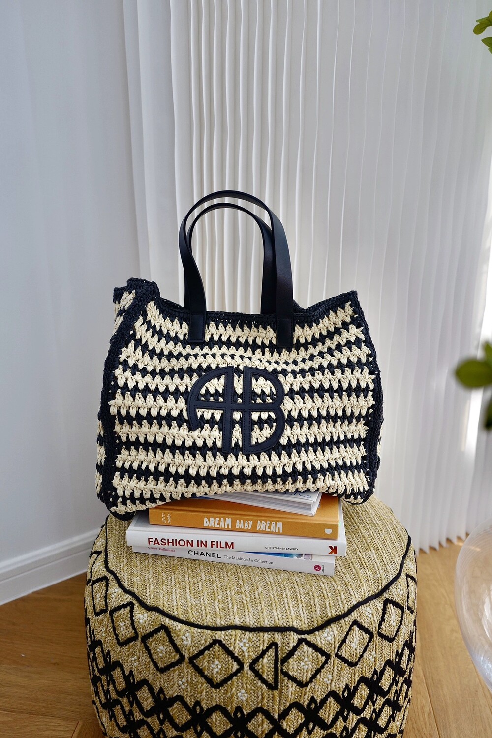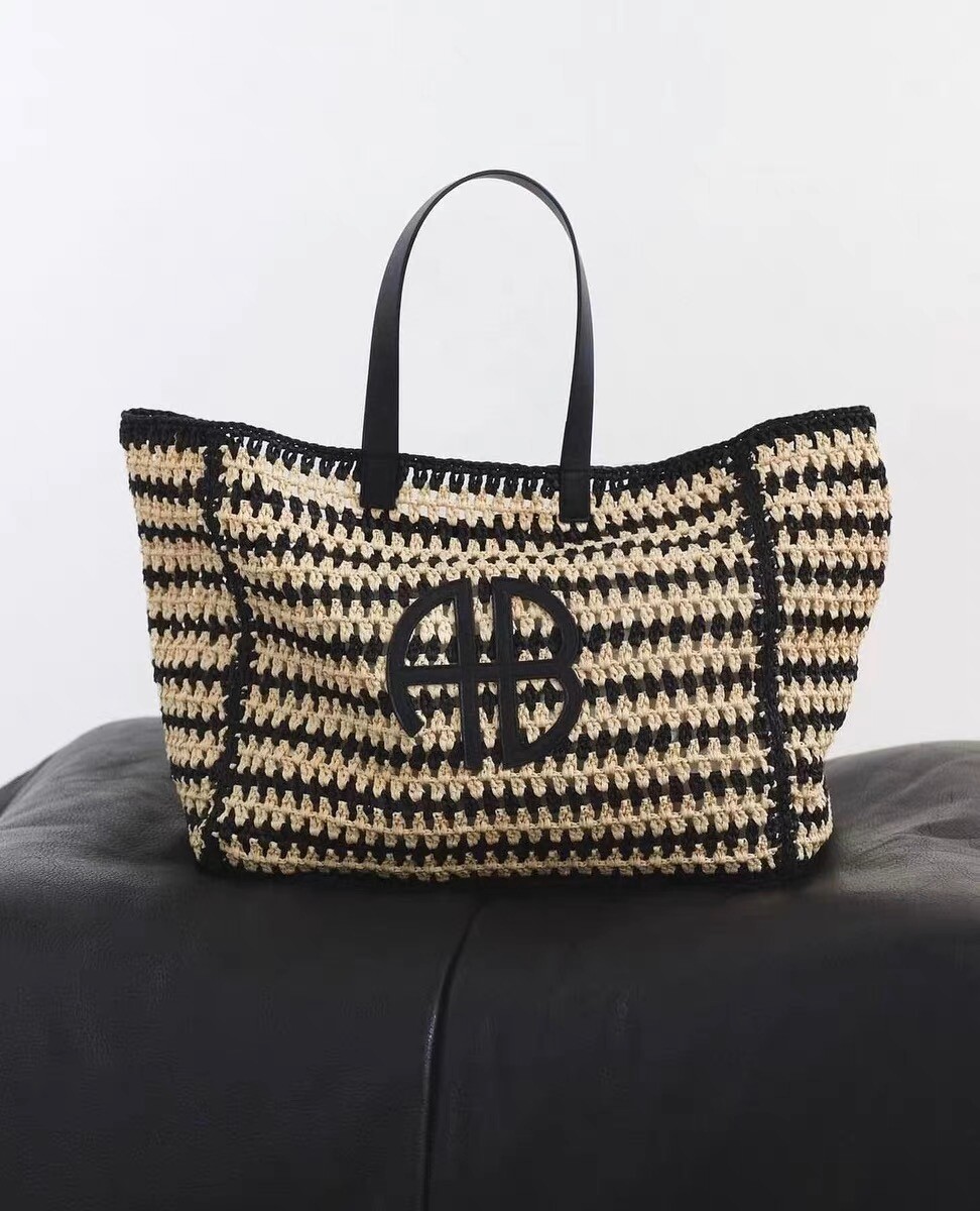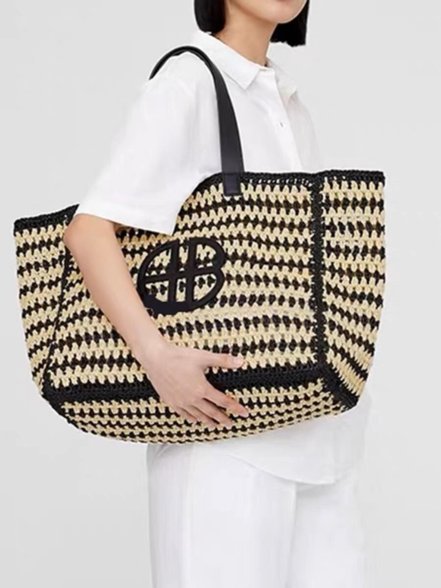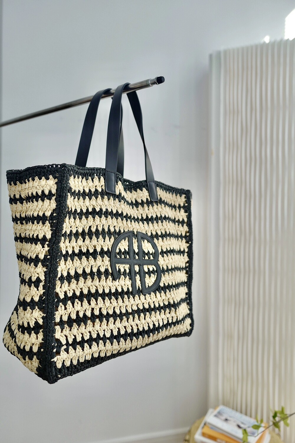 블랙, 샌드 베이지, 인터우븐 디자인, 앞면의 로고 패치, 두 개의 탑 핸들, 윗 부분이 트인 디자인, 메인 칸.