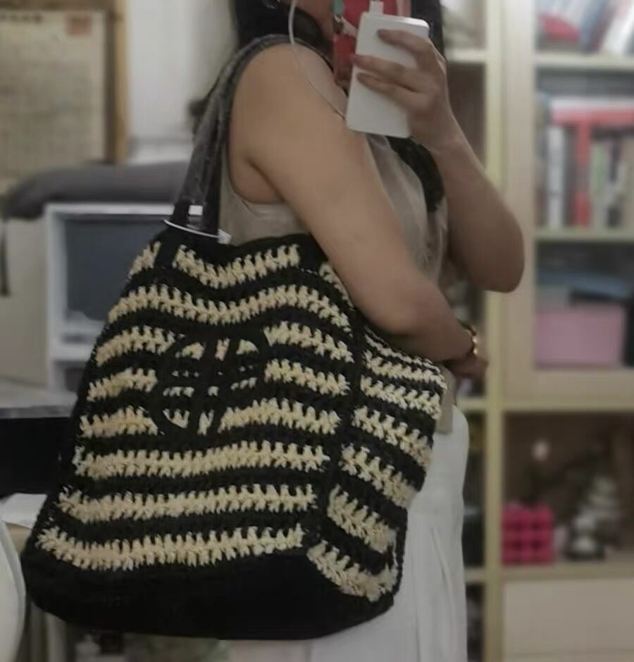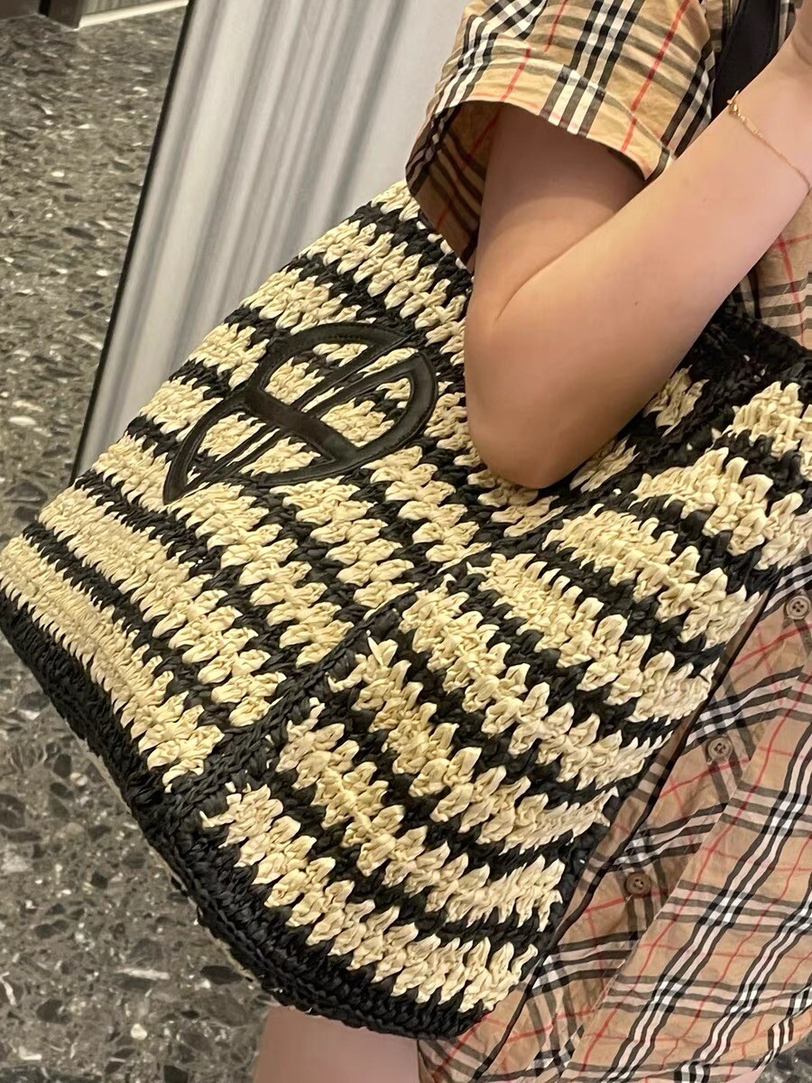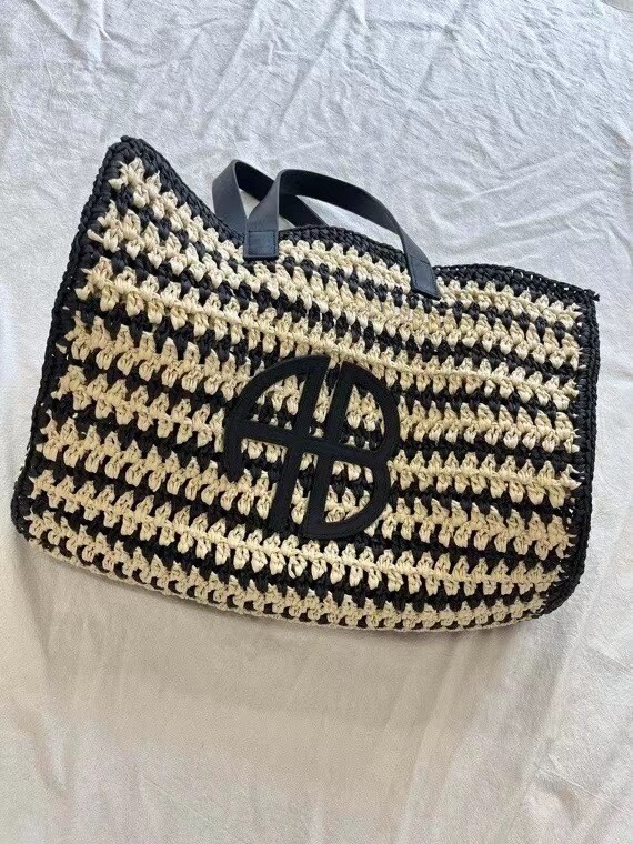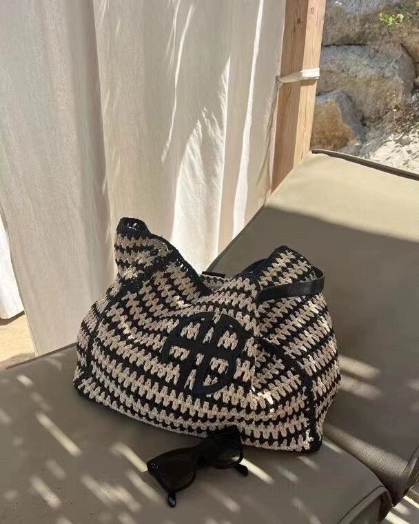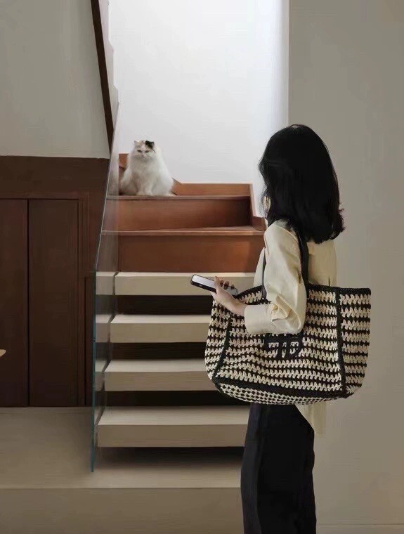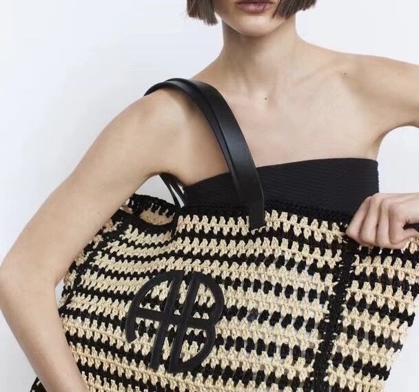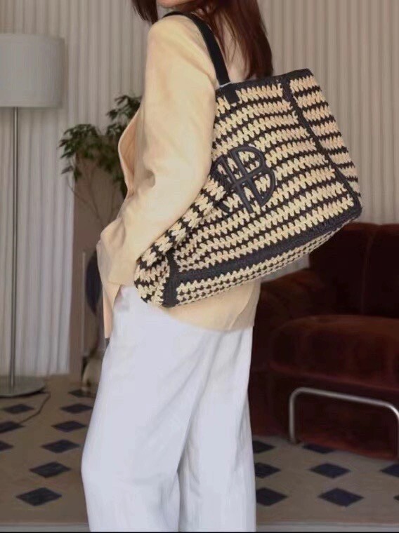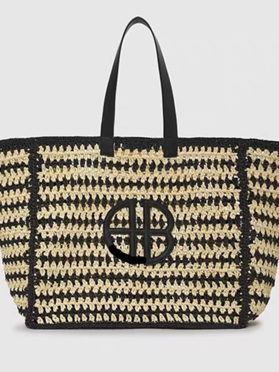 블랙, 샌드 베이지, 인터우븐 디자인, 앞면의 로고 패치, 두 개의 탑 핸들, 윗 부분이 트인 디자인, 메인 칸.