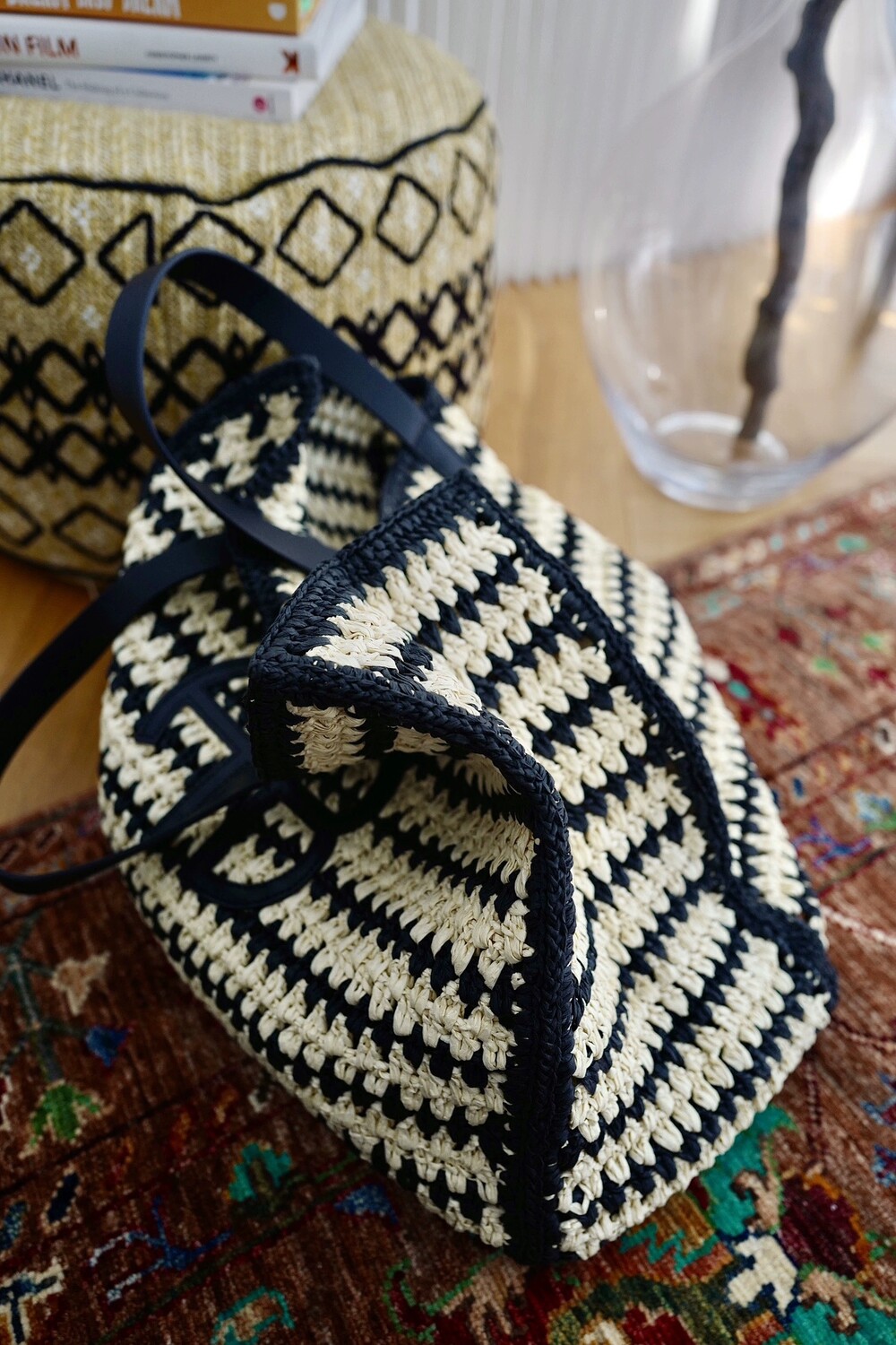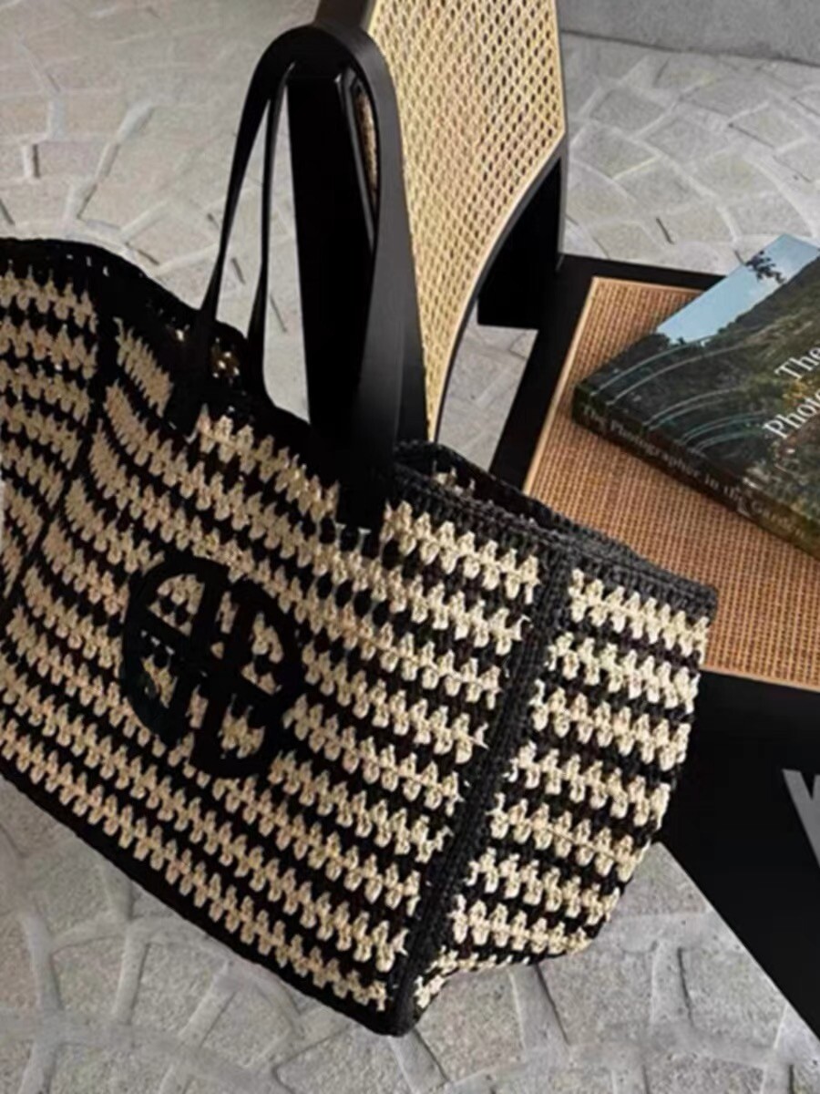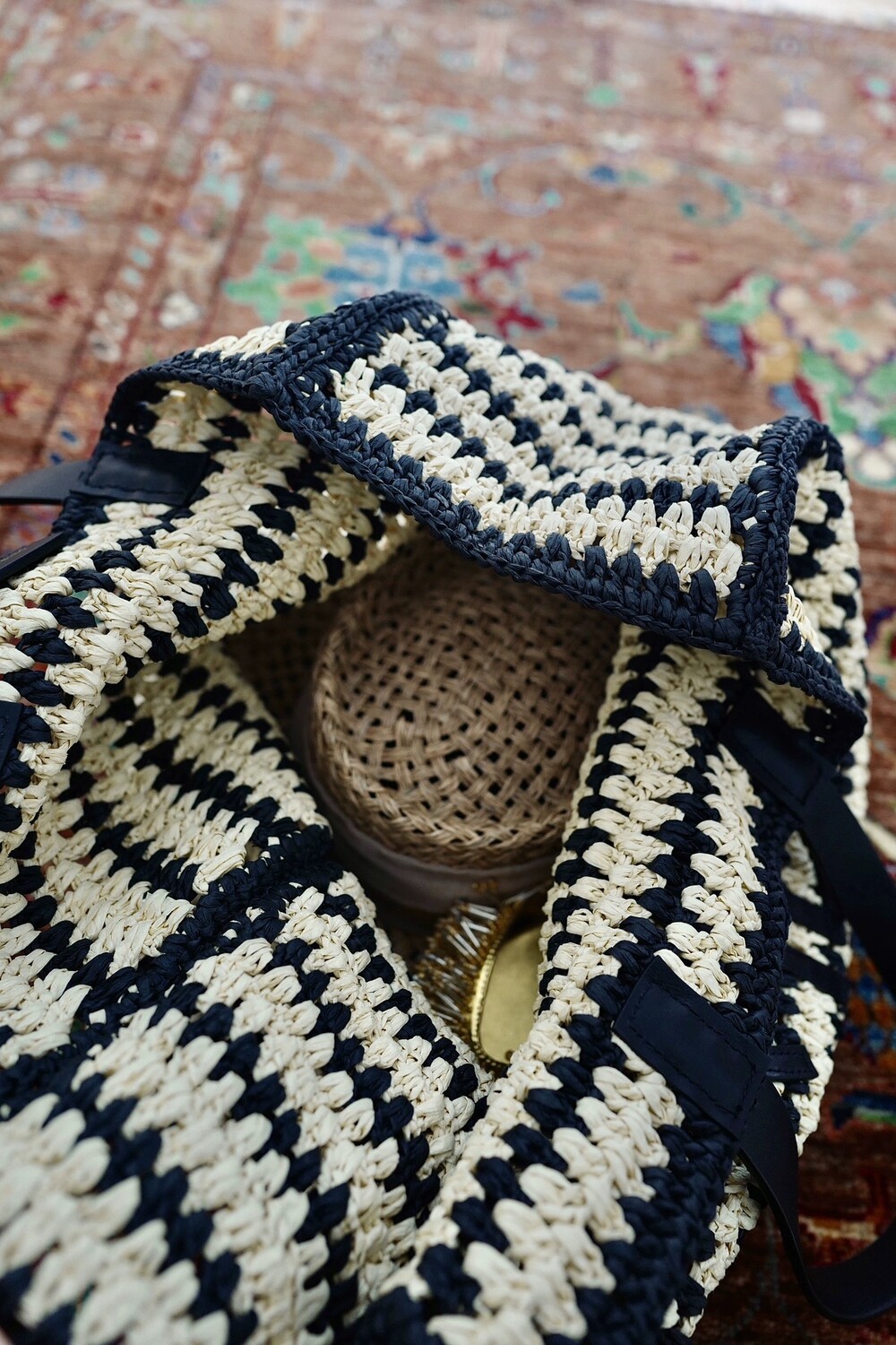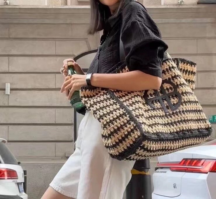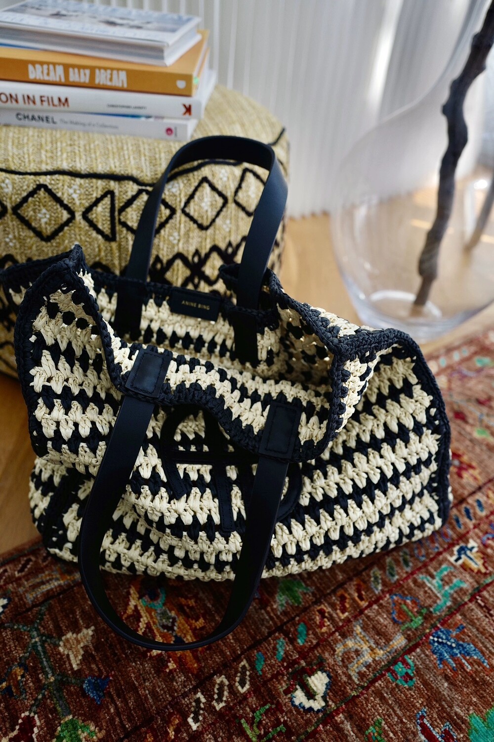 블랙, 샌드 베이지, 인터우븐 디자인, 앞면의 로고 패치, 두 개의 탑 핸들, 윗 부분이 트인 디자인, 메인 칸.