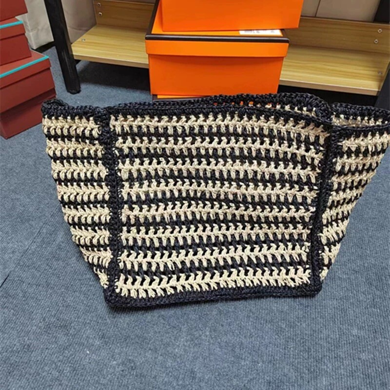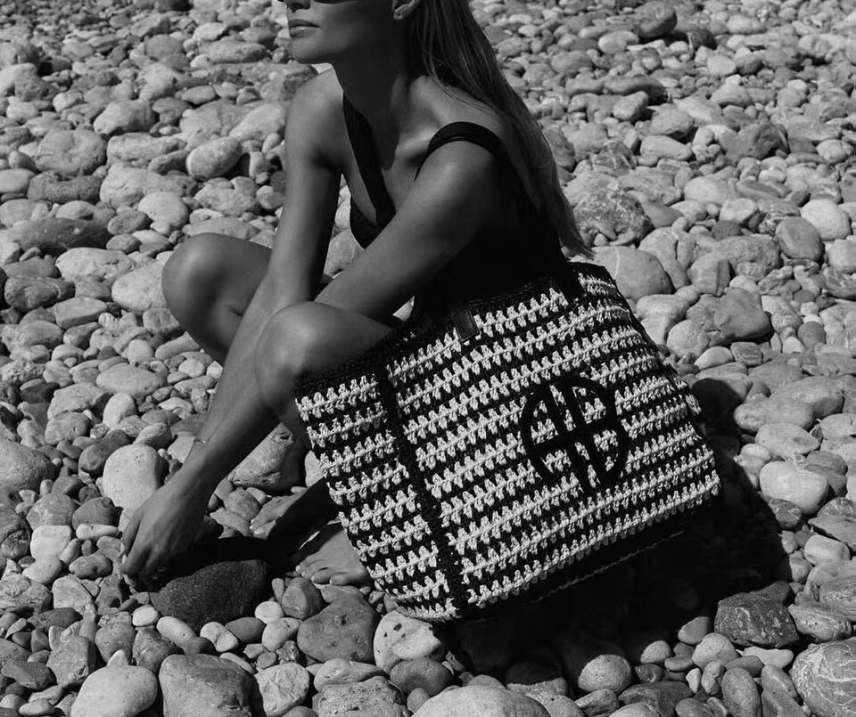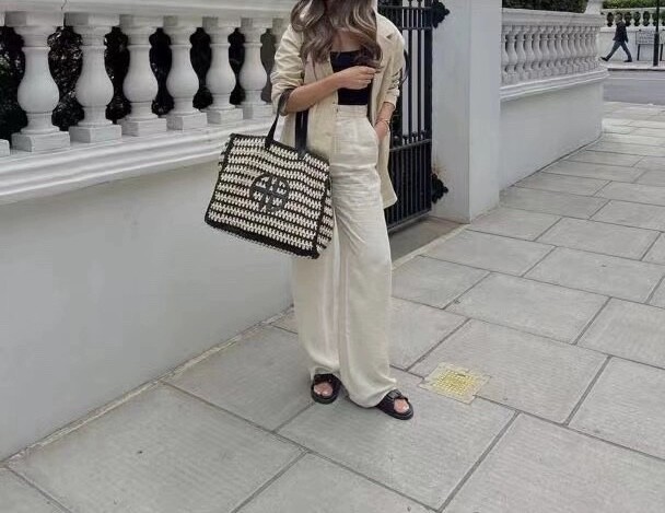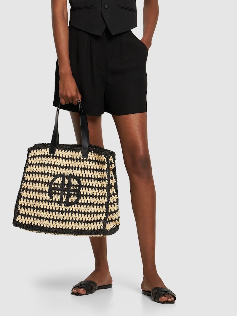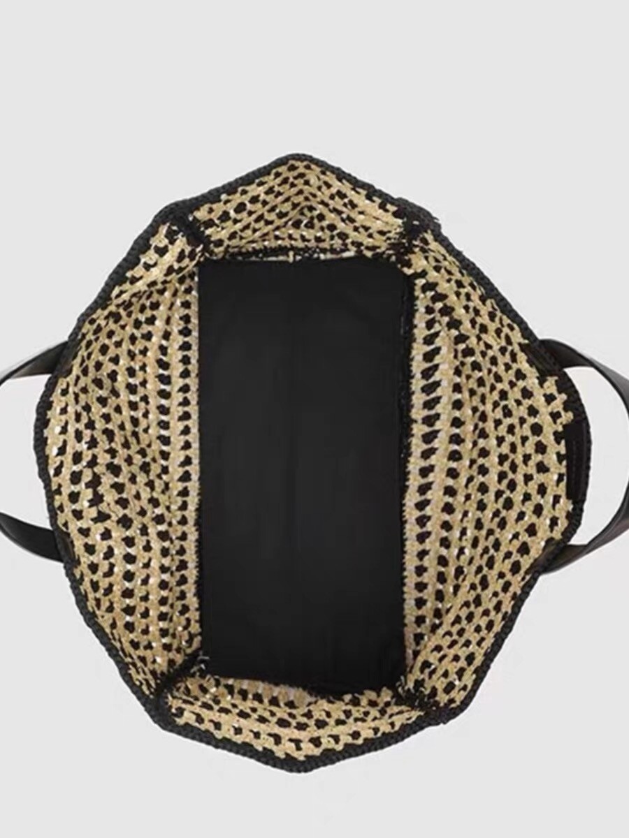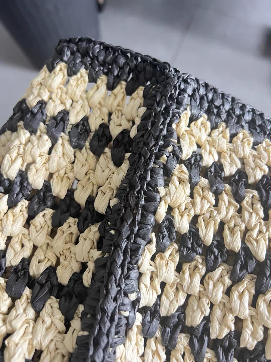블랙, 샌드 베이지, 인터우븐 디자인, 앞면의 로고 패치, 두 개의 탑 핸들, 윗 부분이 트인 디자인, 메인 칸.