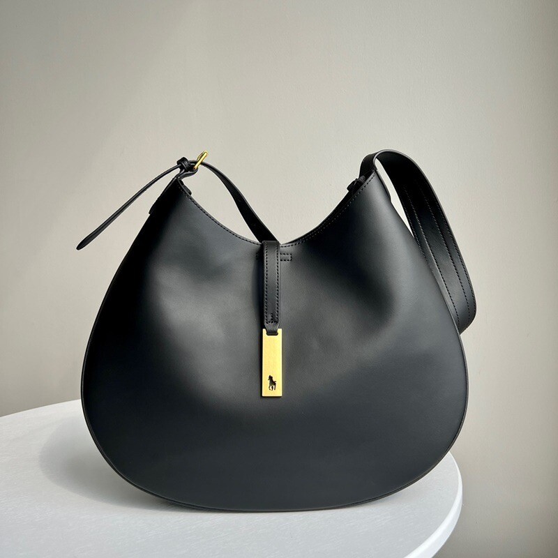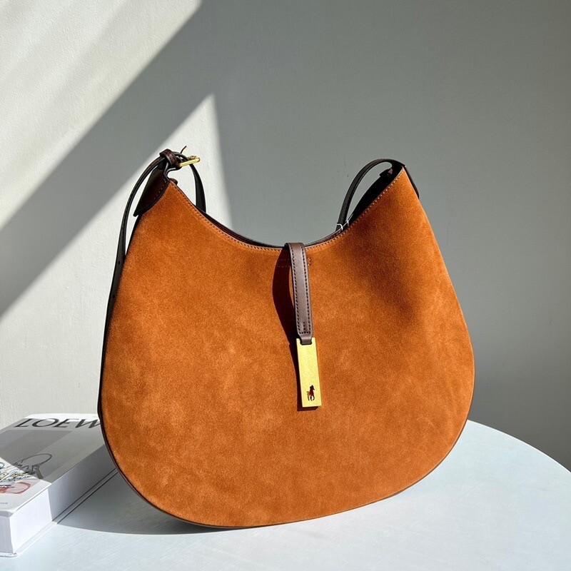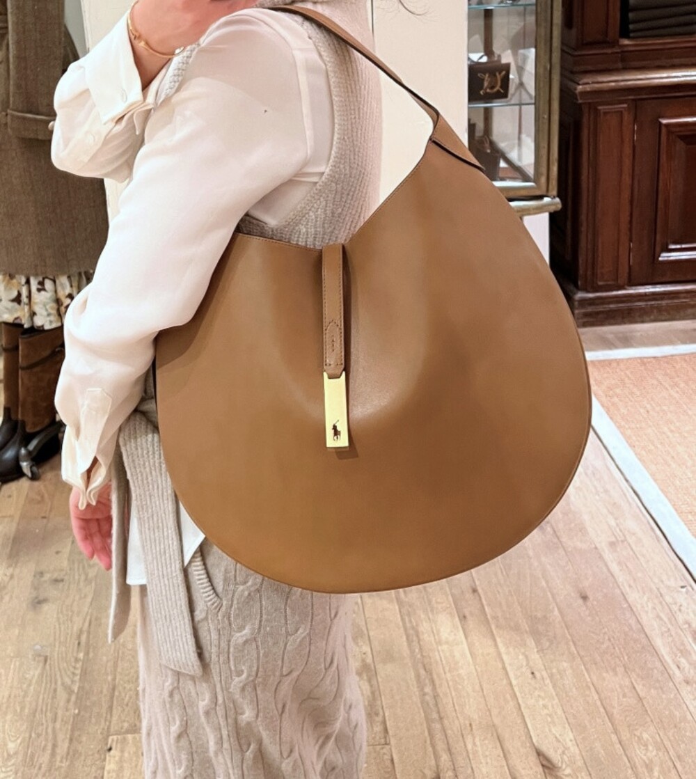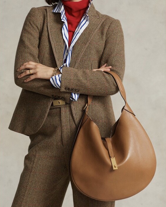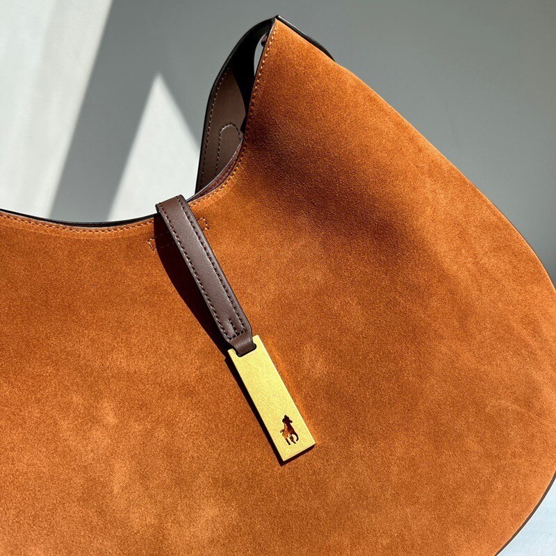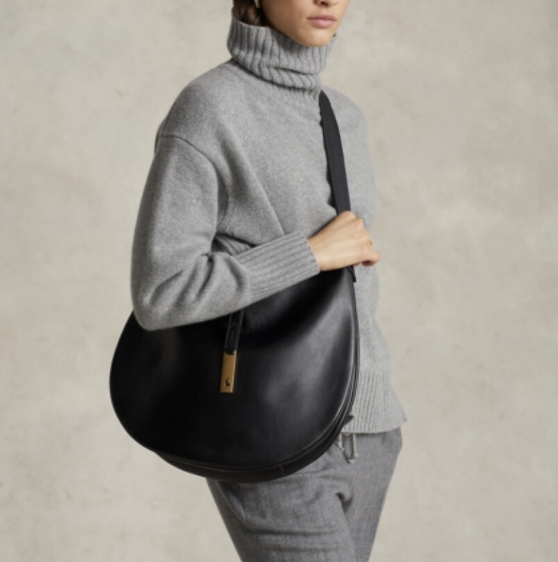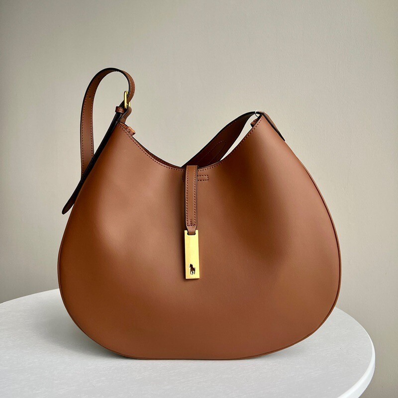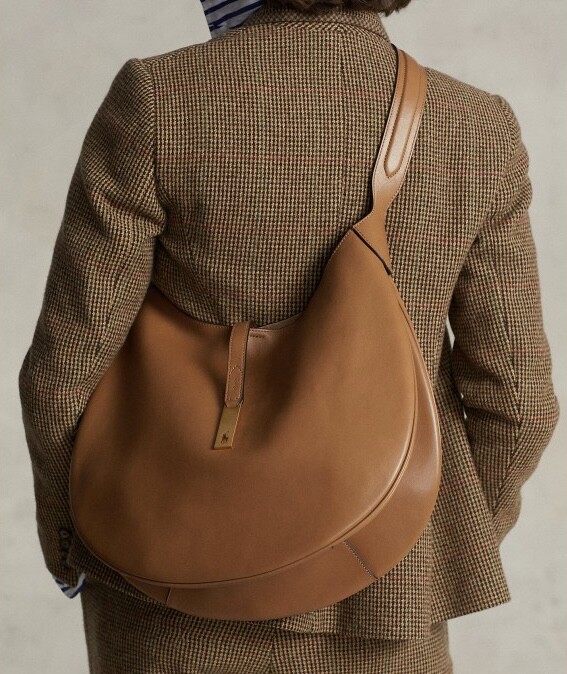 모험, 로맨스, 낙관주의에서 영감을 받은 RL* 의 일부인 이 가죽 숄더백은 넉넉한 이중 수납 공간 안장 실루엣과 살짝 솟아오른 봄베 디테일로 은은한 승마 감성을 불러일으킵니다. 스트랩, 유연한 본디드 스웨이드 내부 구조. 빈티지 ID 팔찌를 연상시키는 골드 톤 브라스 하드웨어에 시그니처 포니의 실루엣을 컷팅한 브라스 명판으로 마감했습니다.