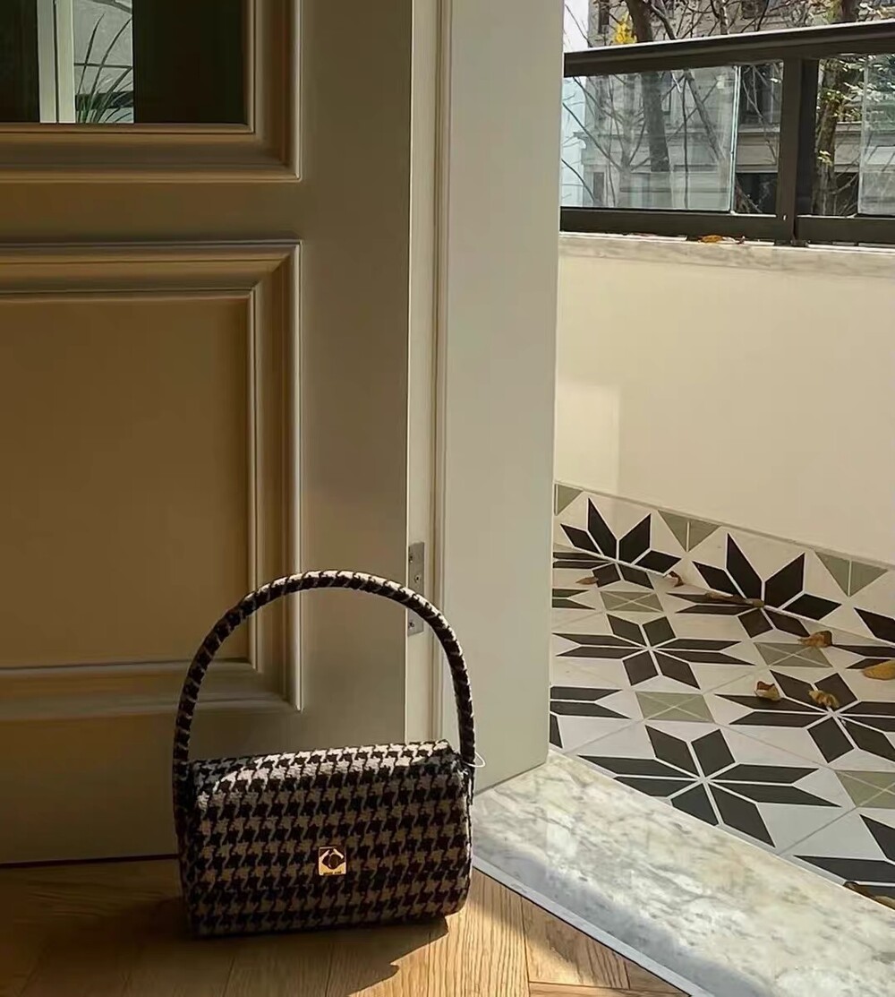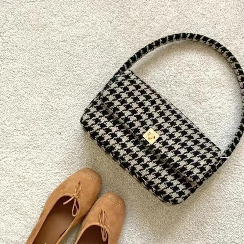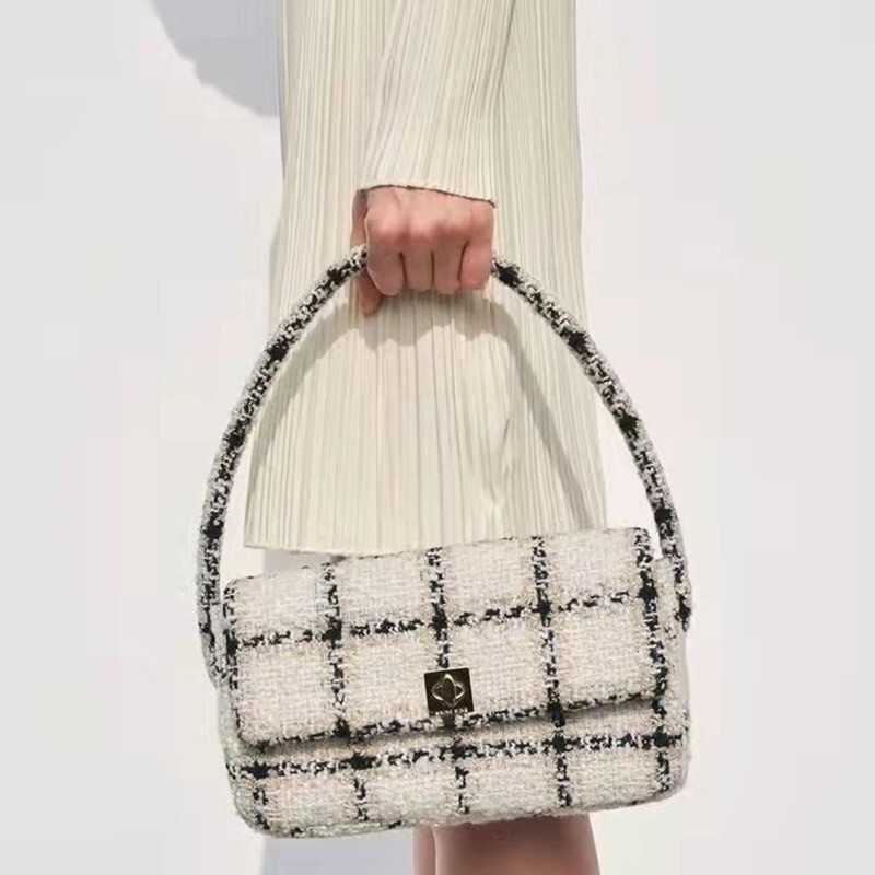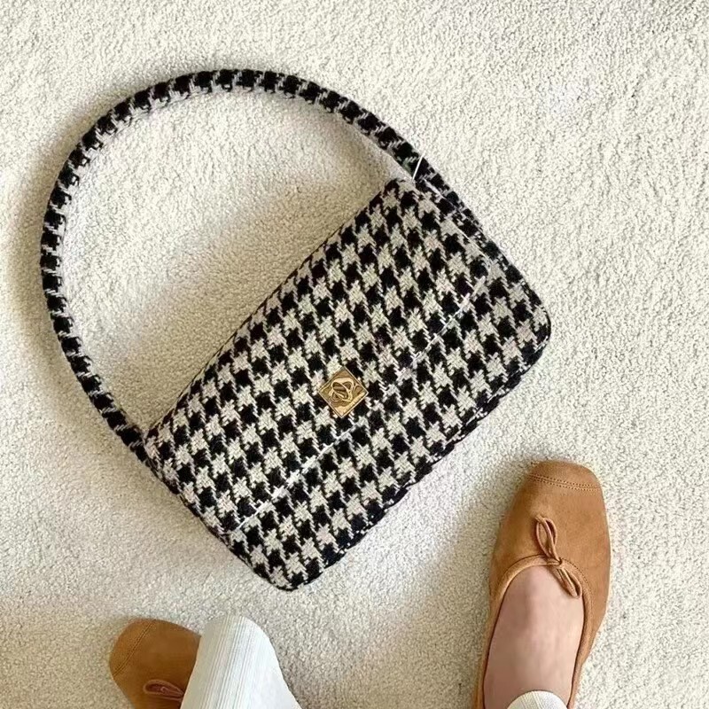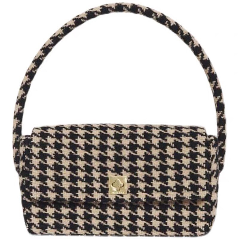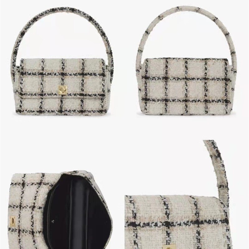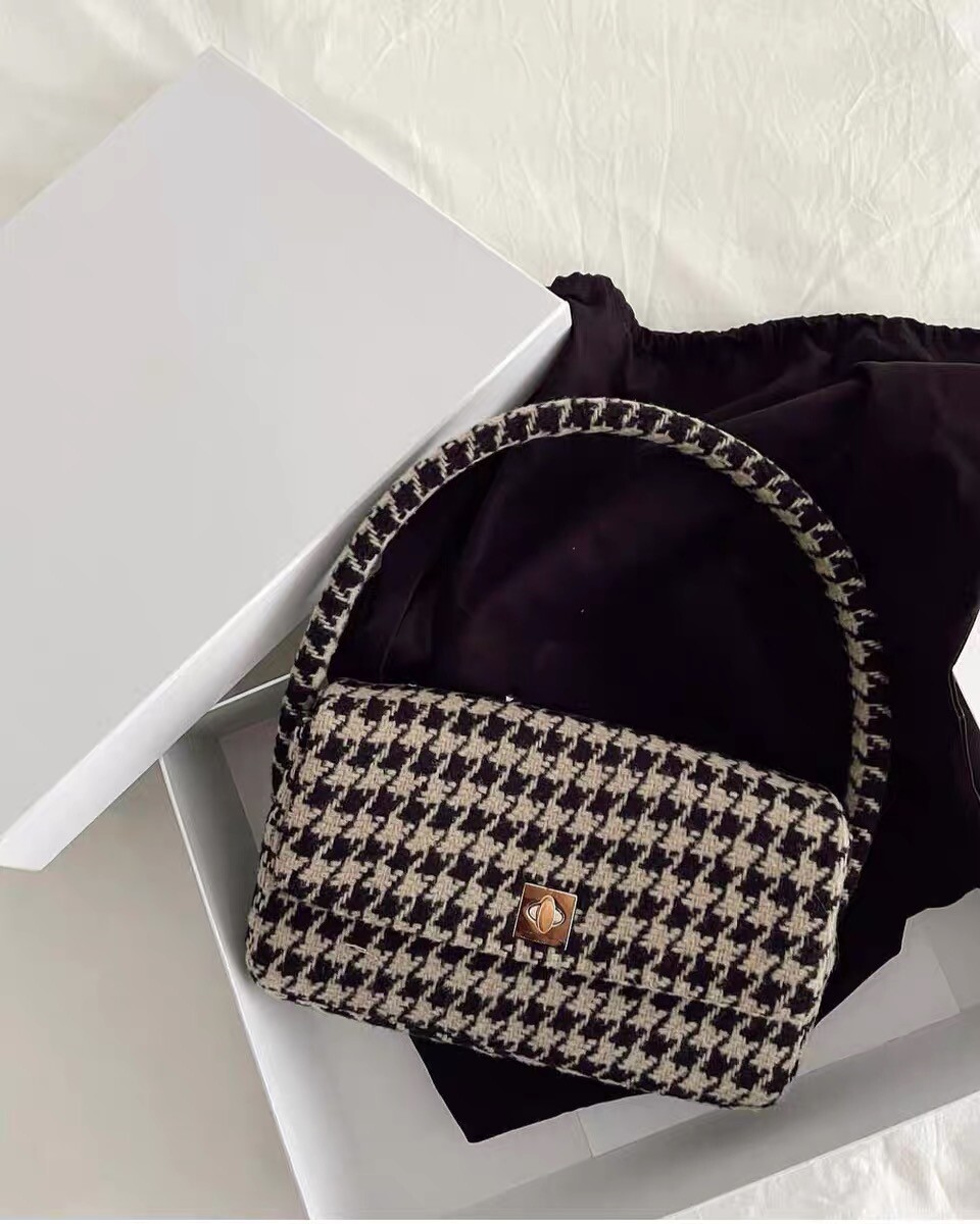 체크 패턴, 핸드백으로 연출, 신 스트랩, 내부 지퍼 포켓, 피벗 클로저, 플랩 클로징, 싱글 핸들.