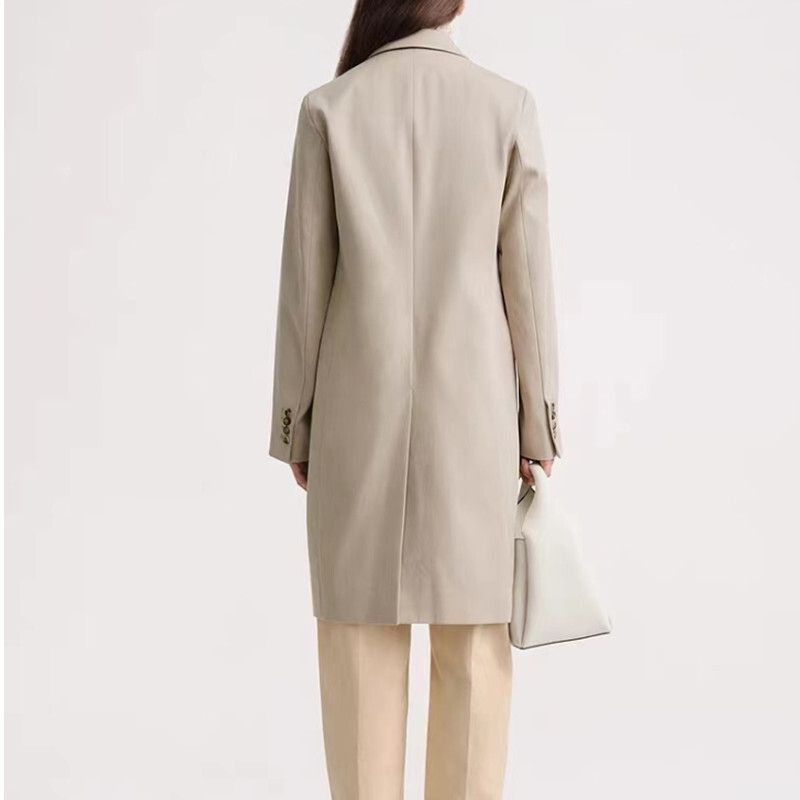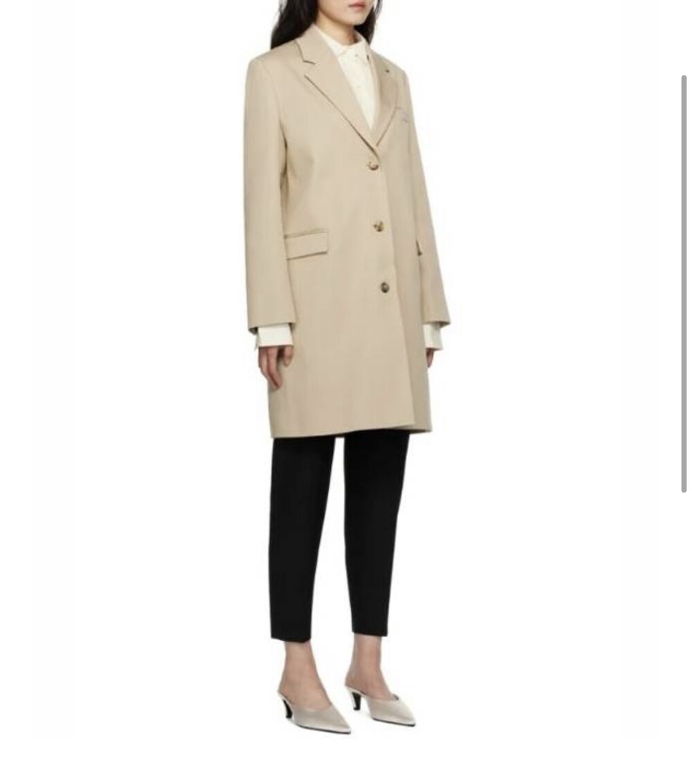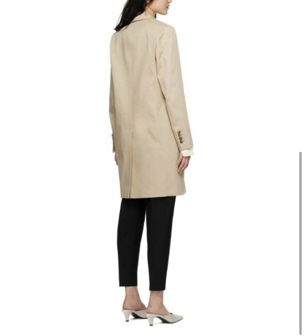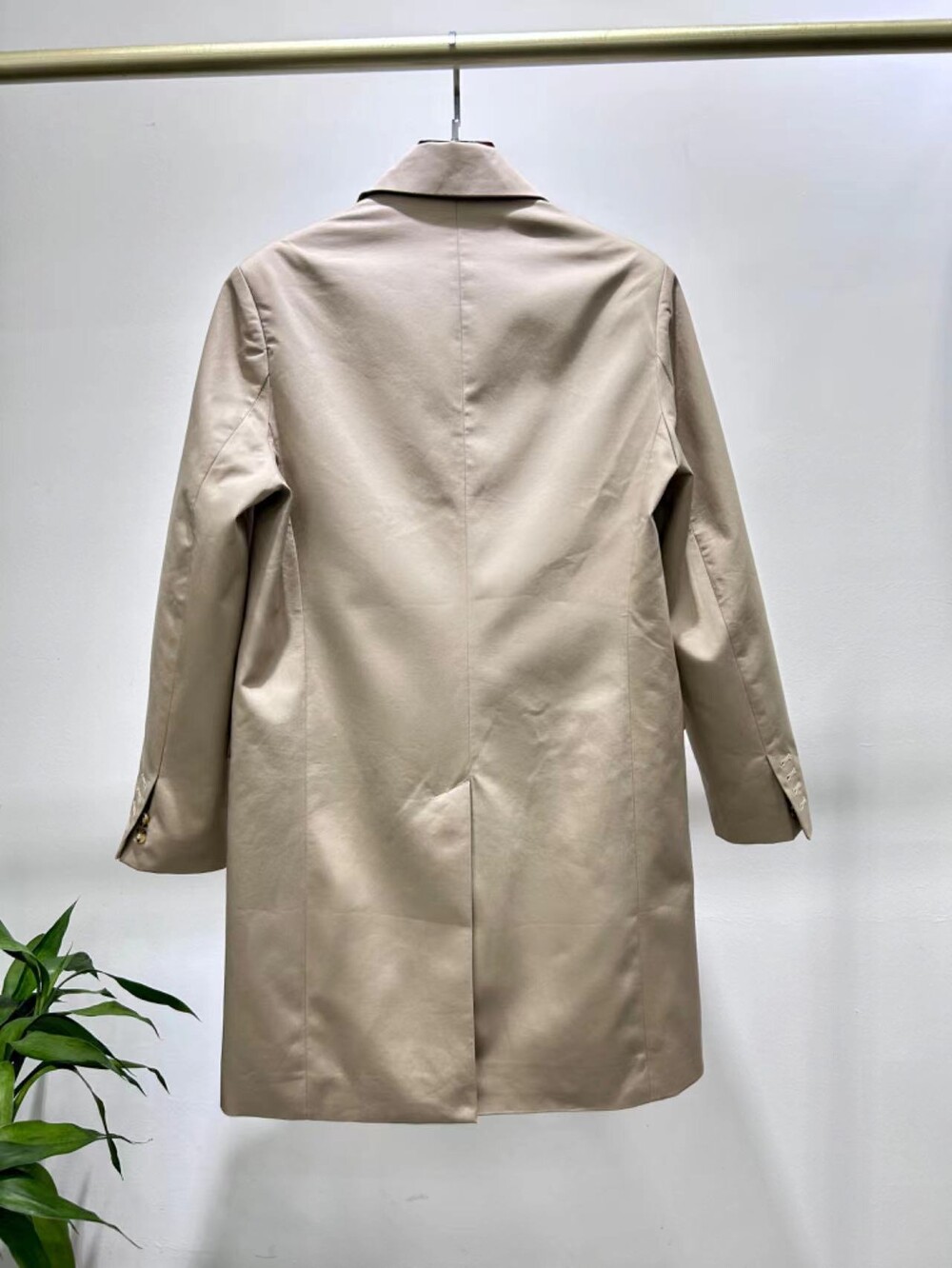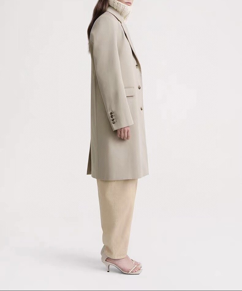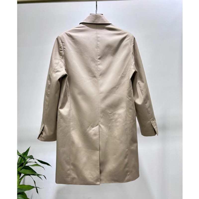 코튼 개버딘 코트. • 노치 라펠 · 버튼 여밈. 플랩 포켓. 버튼 4개 소맷단. 내부에 웰트 포켓