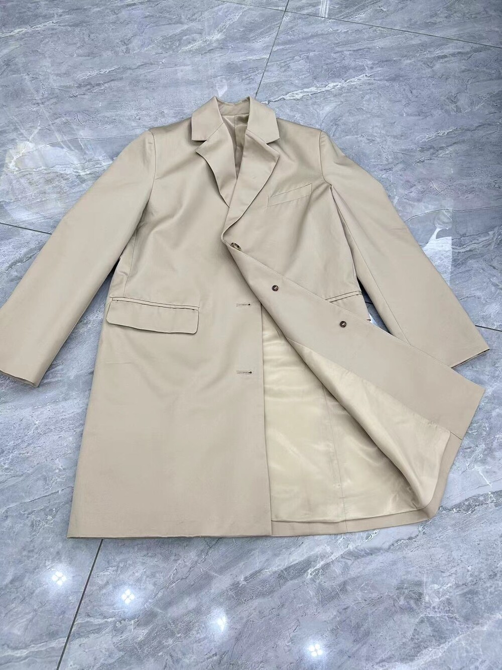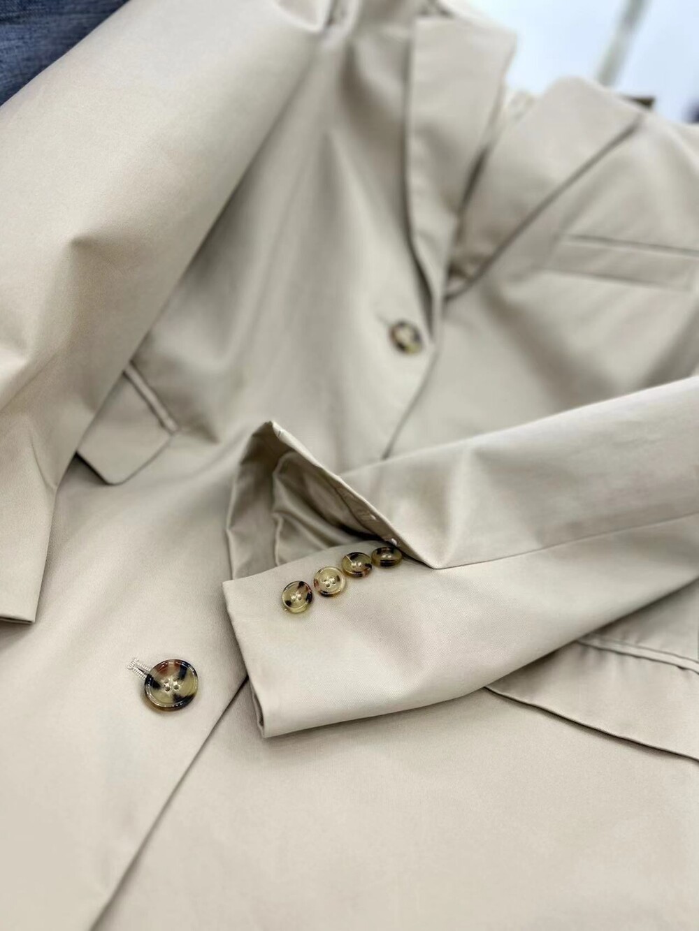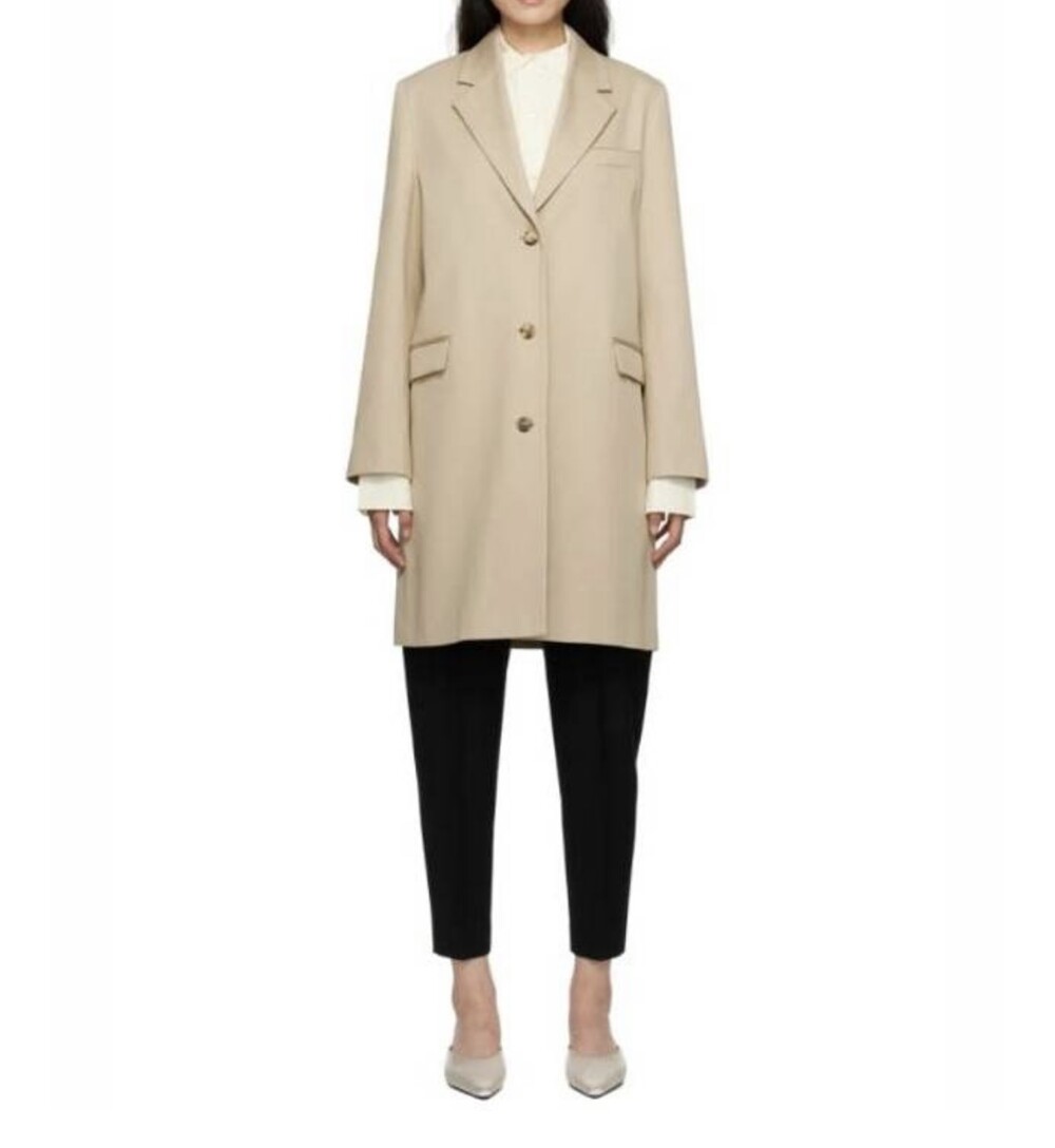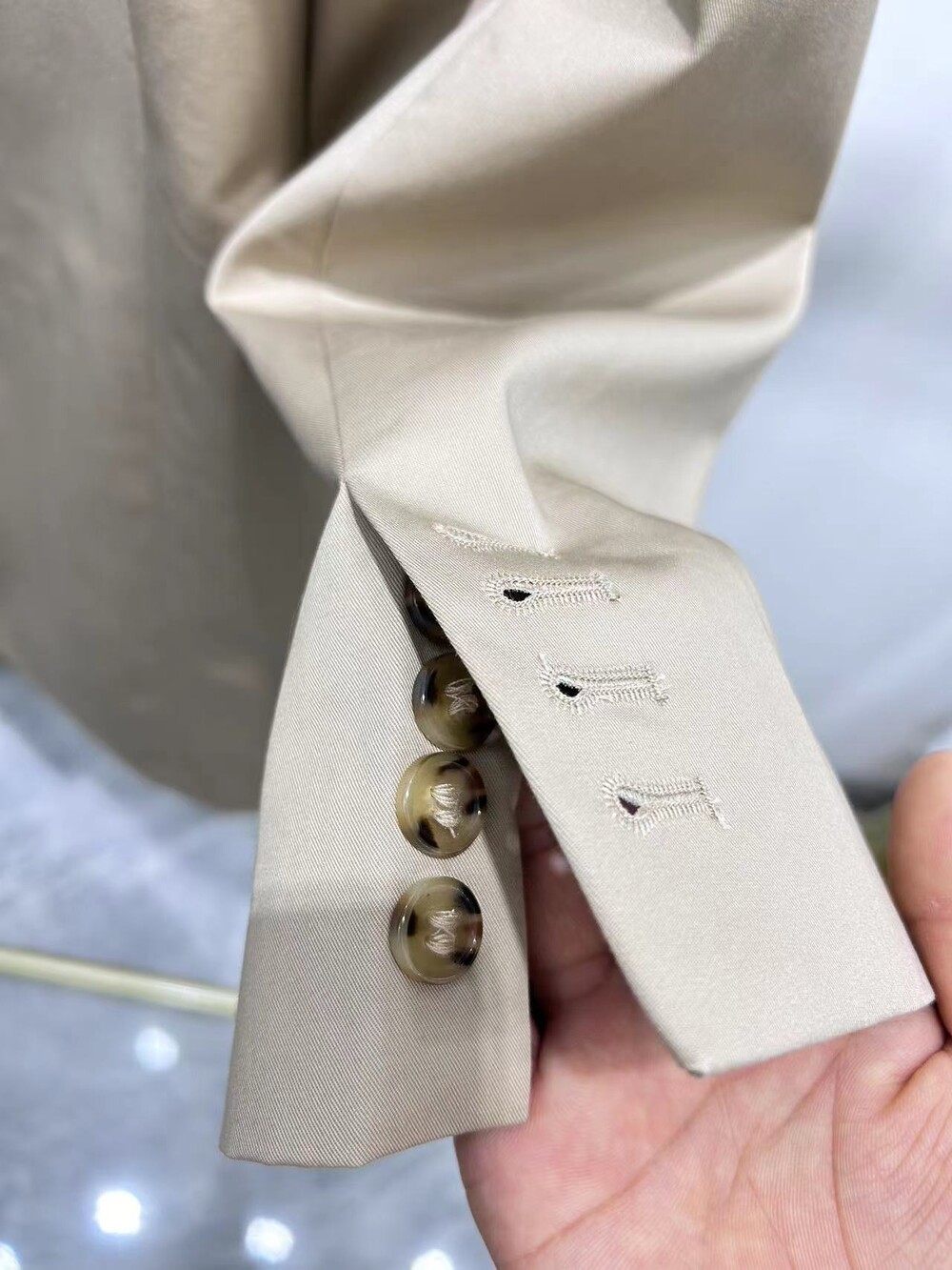 코튼 개버딘 코트. • 노치 라펠 · 버튼 여밈. 플랩 포켓. 버튼 4개 소맷단. 내부에 웰트 포켓