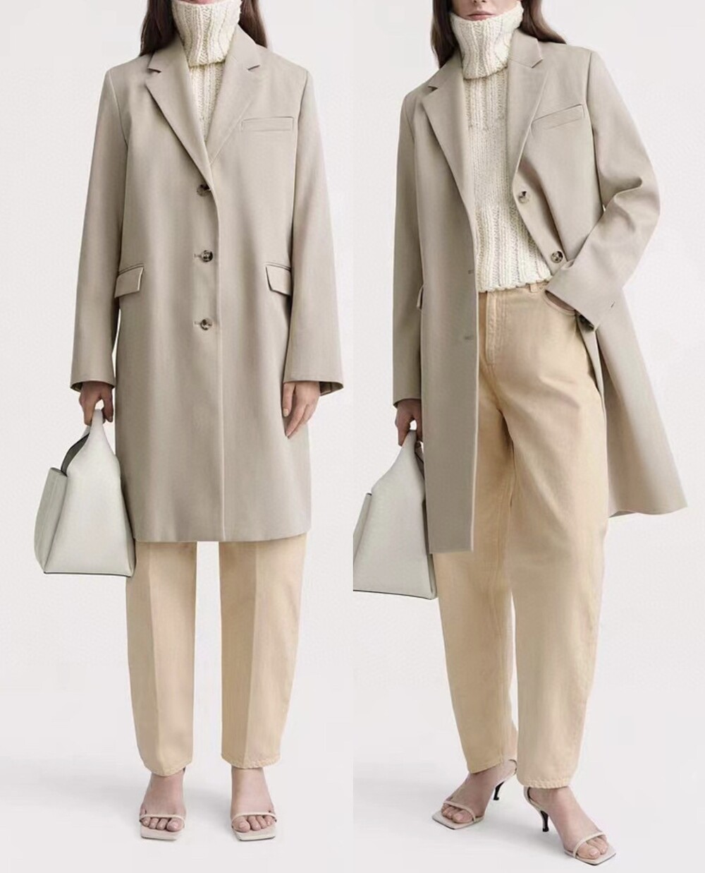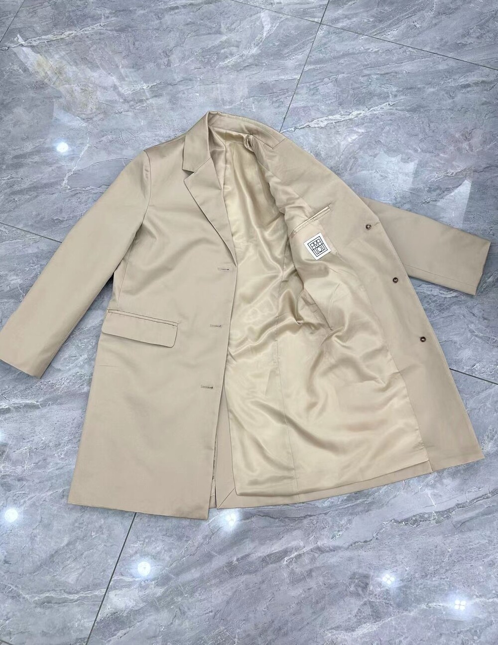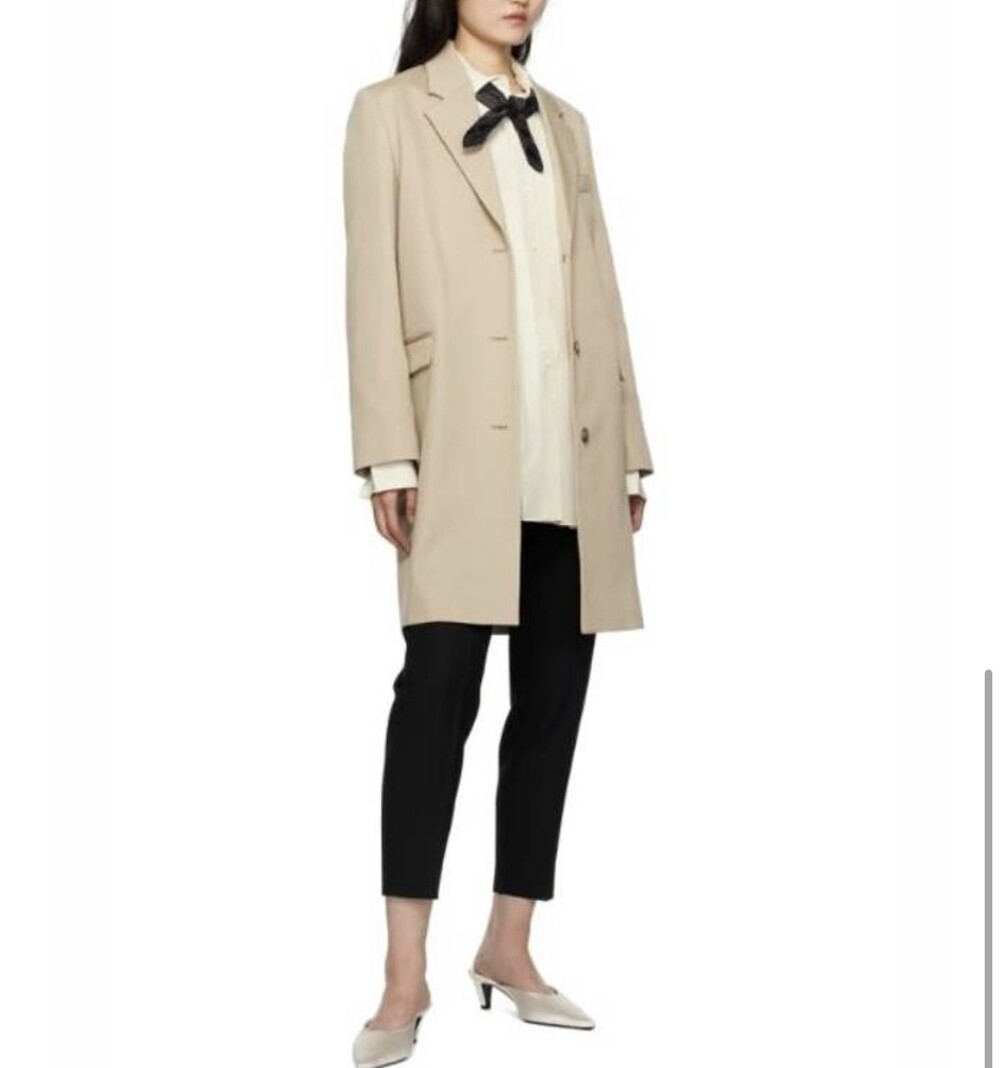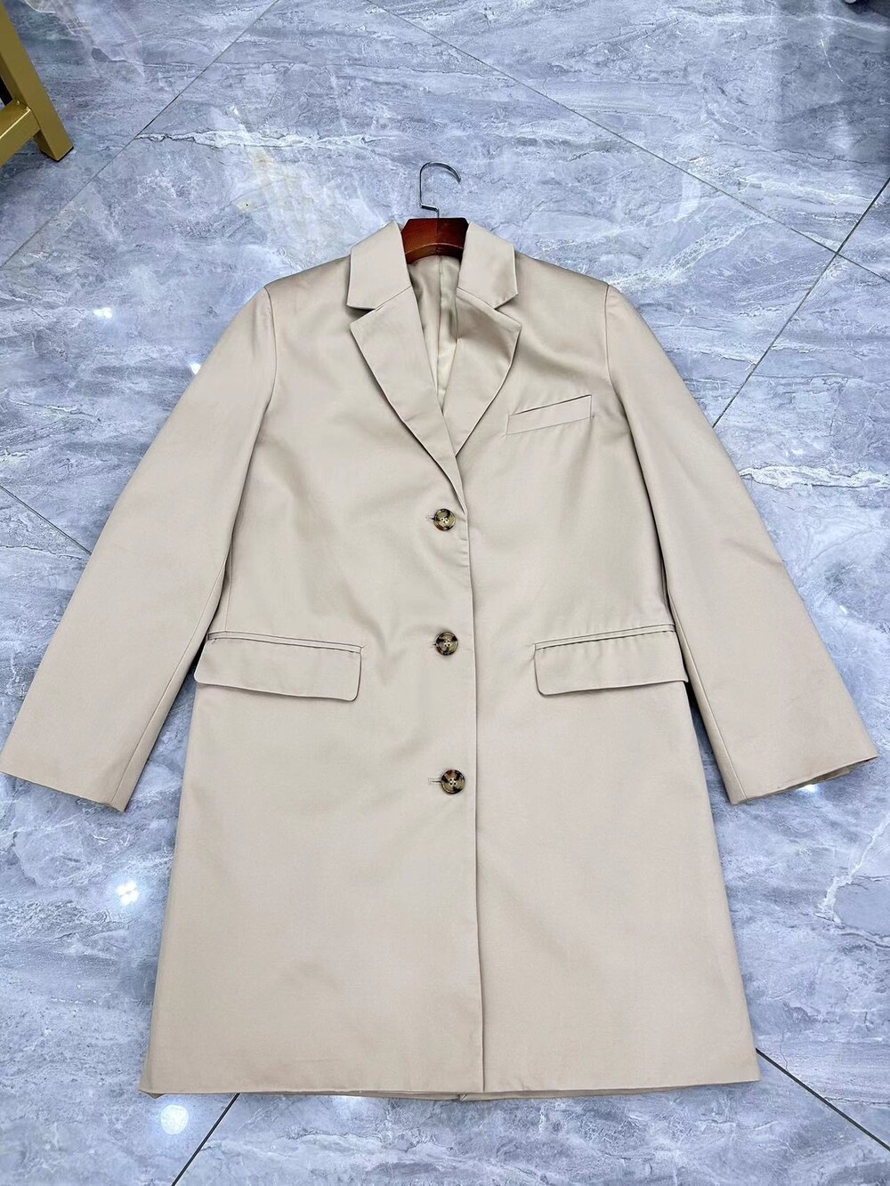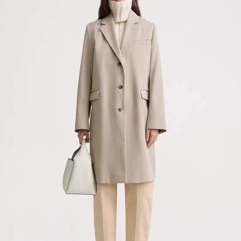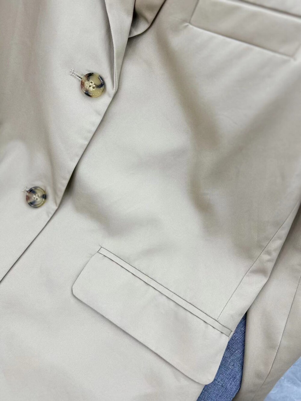 코튼 개버딘 코트. • 노치 라펠 · 버튼 여밈. 플랩 포켓. 버튼 4개 소맷단. 내부에 웰트 포켓