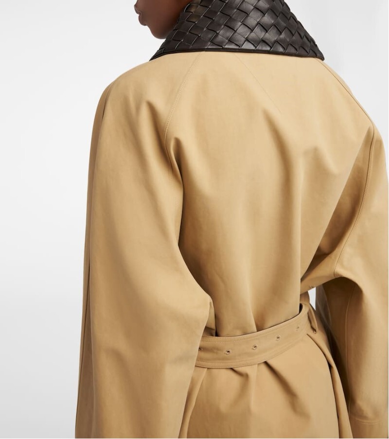 BV*코튼 개버딘 트렌치 코트는 고급스러운 디자인과 트렌디한 디테일로 여성의 우아한 스타일을 완성합니다. 가죽 트리밍과 벨트 디테일이 돋보이는 이 제품은 퀄리티 높은 소재와 정교한 제작 기술로 만들어졌습니다.