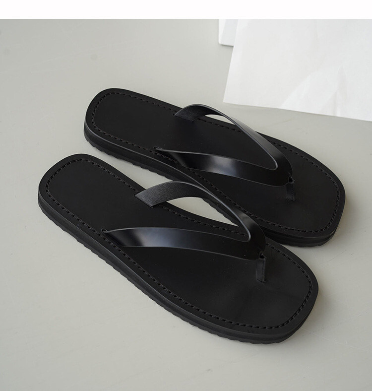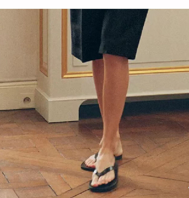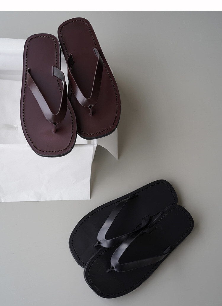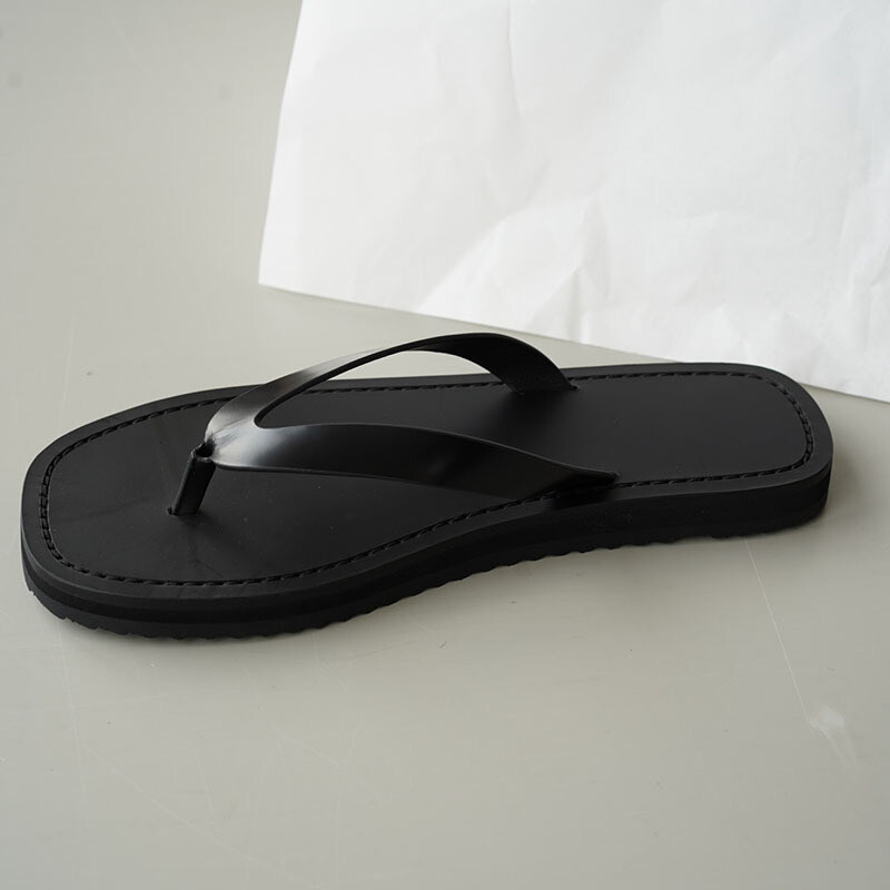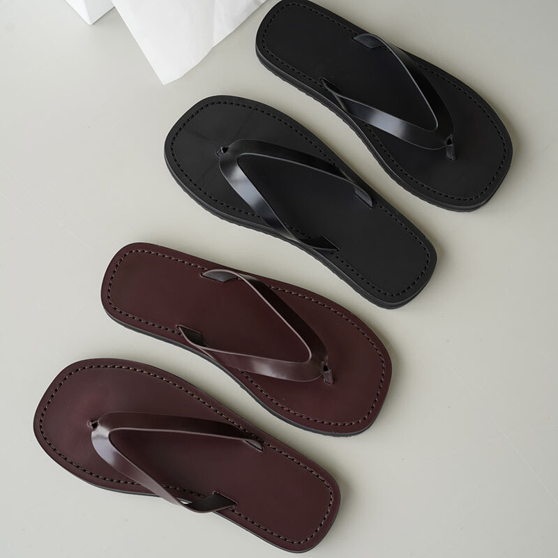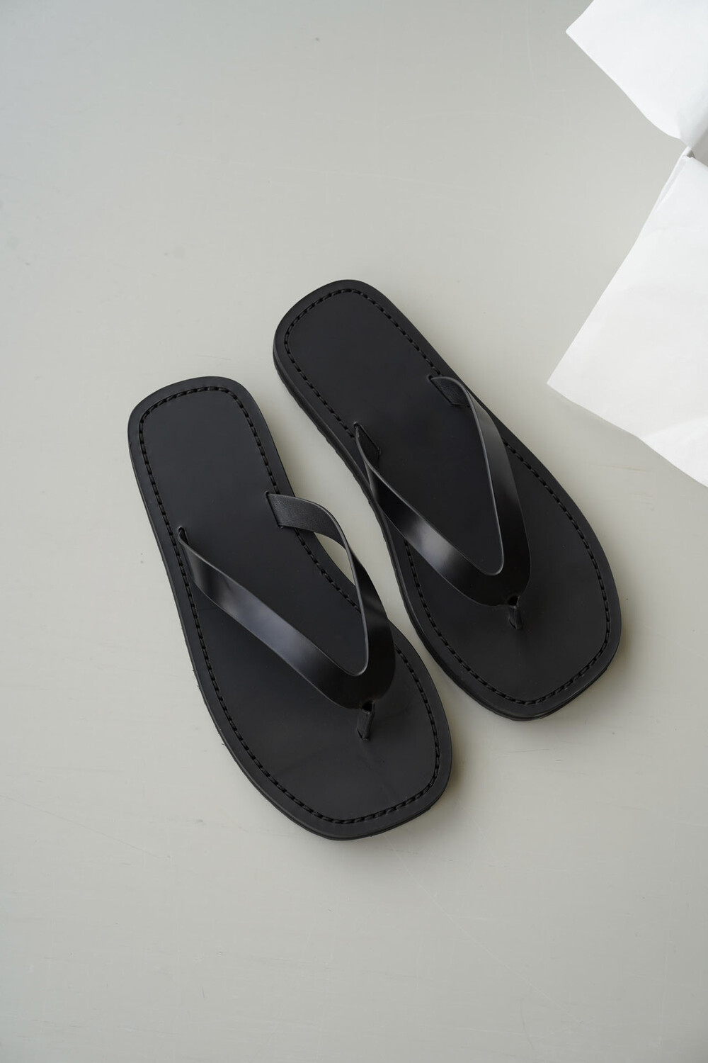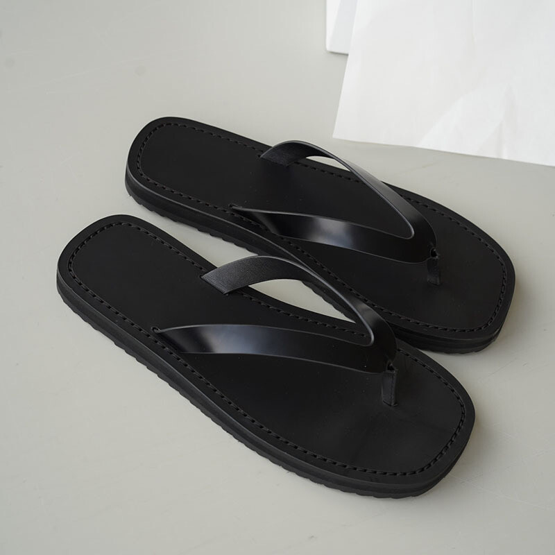 네모난 오픈 토 디자 인에 얇은 끈으로 발등을 감싸는 thong-style 스타일입니다