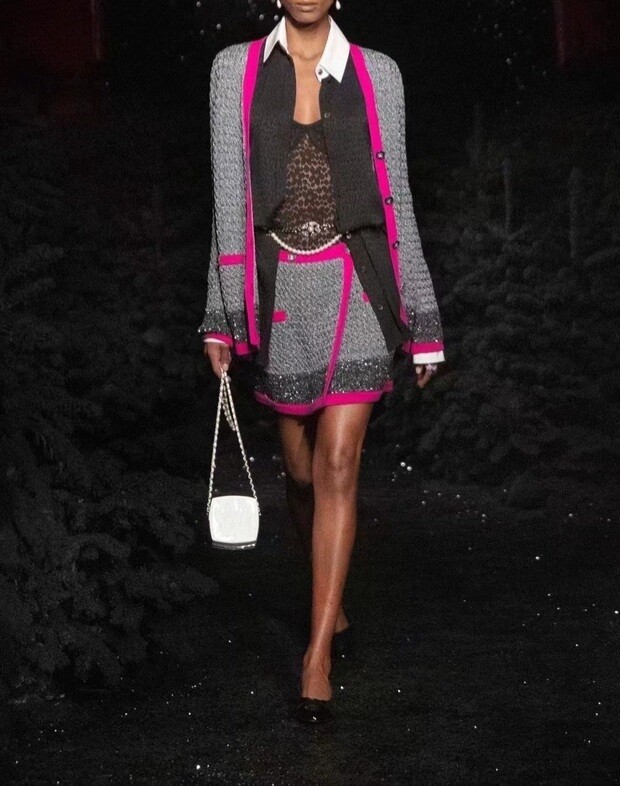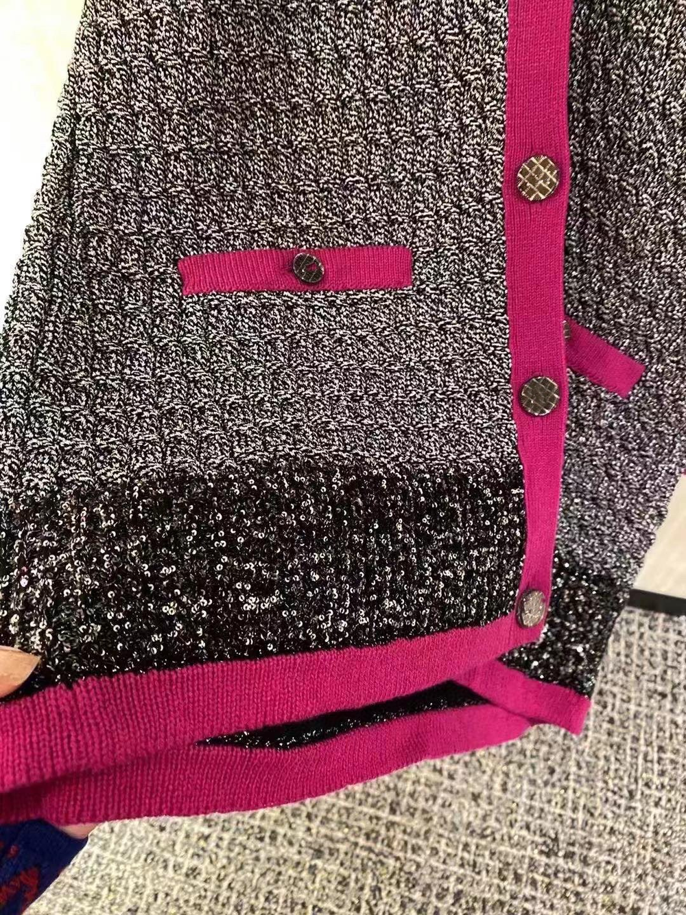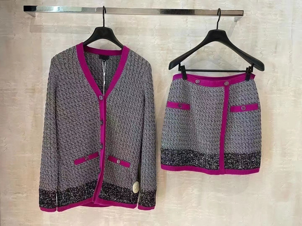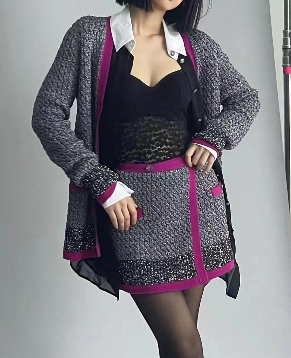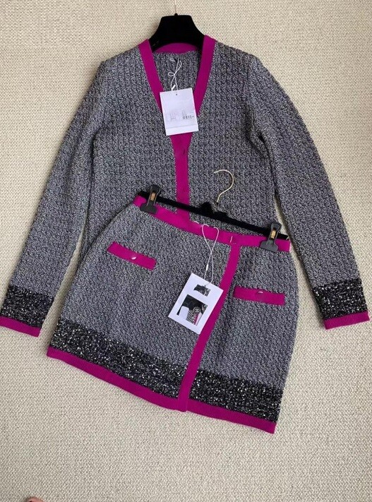 배색으로 대비되어 멋스러움을 느낄 수 있는 니트 투피스 제품입니다