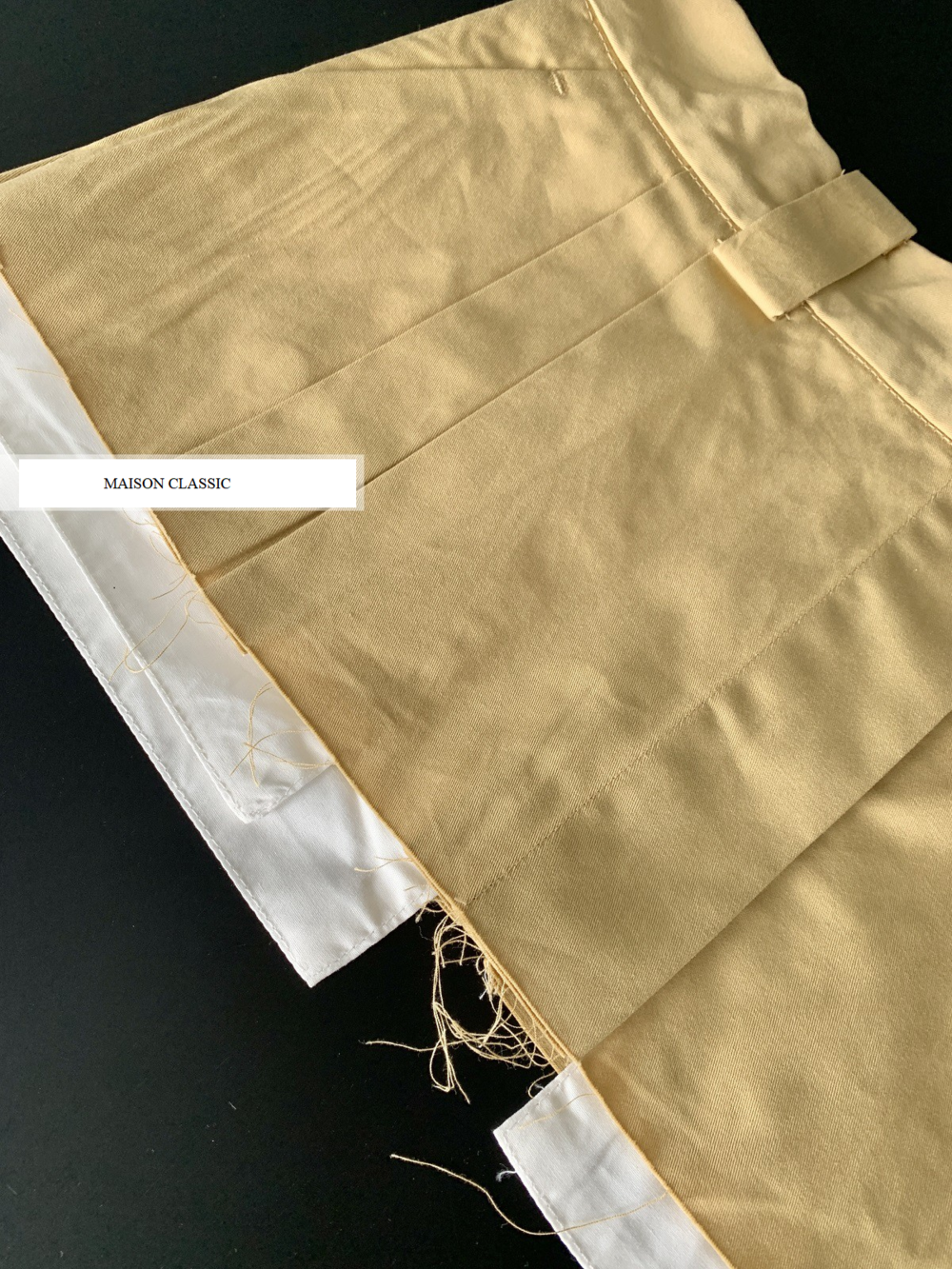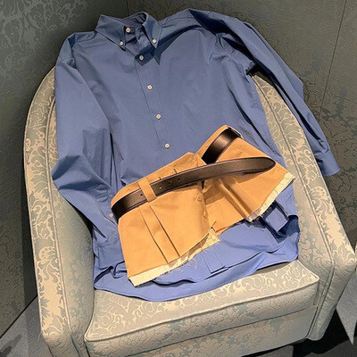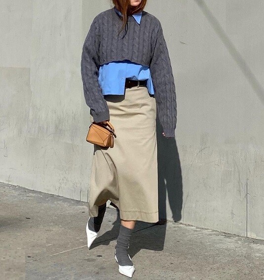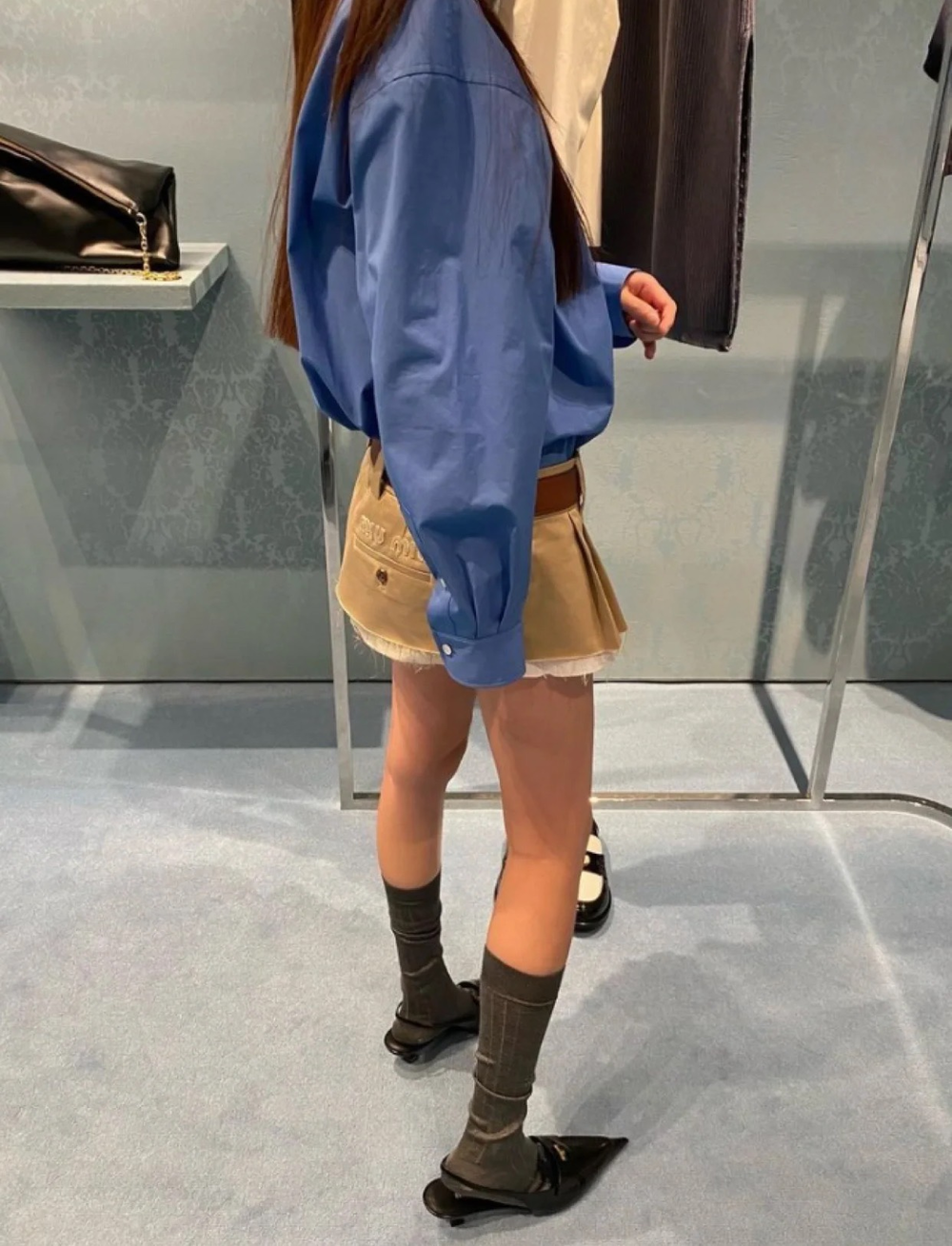 치노스커트와 대비되는 보이프렌드 셔츠 그리고 커팅선을 가위로 자른듯한