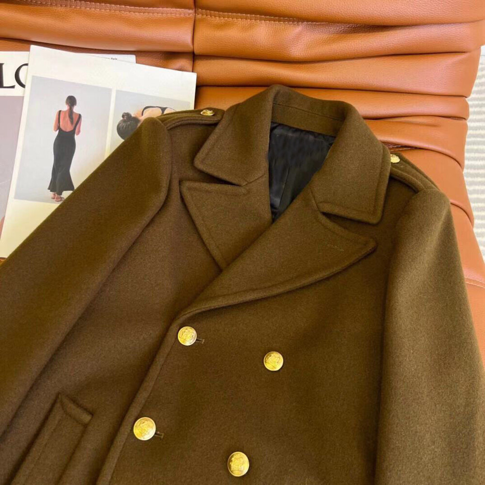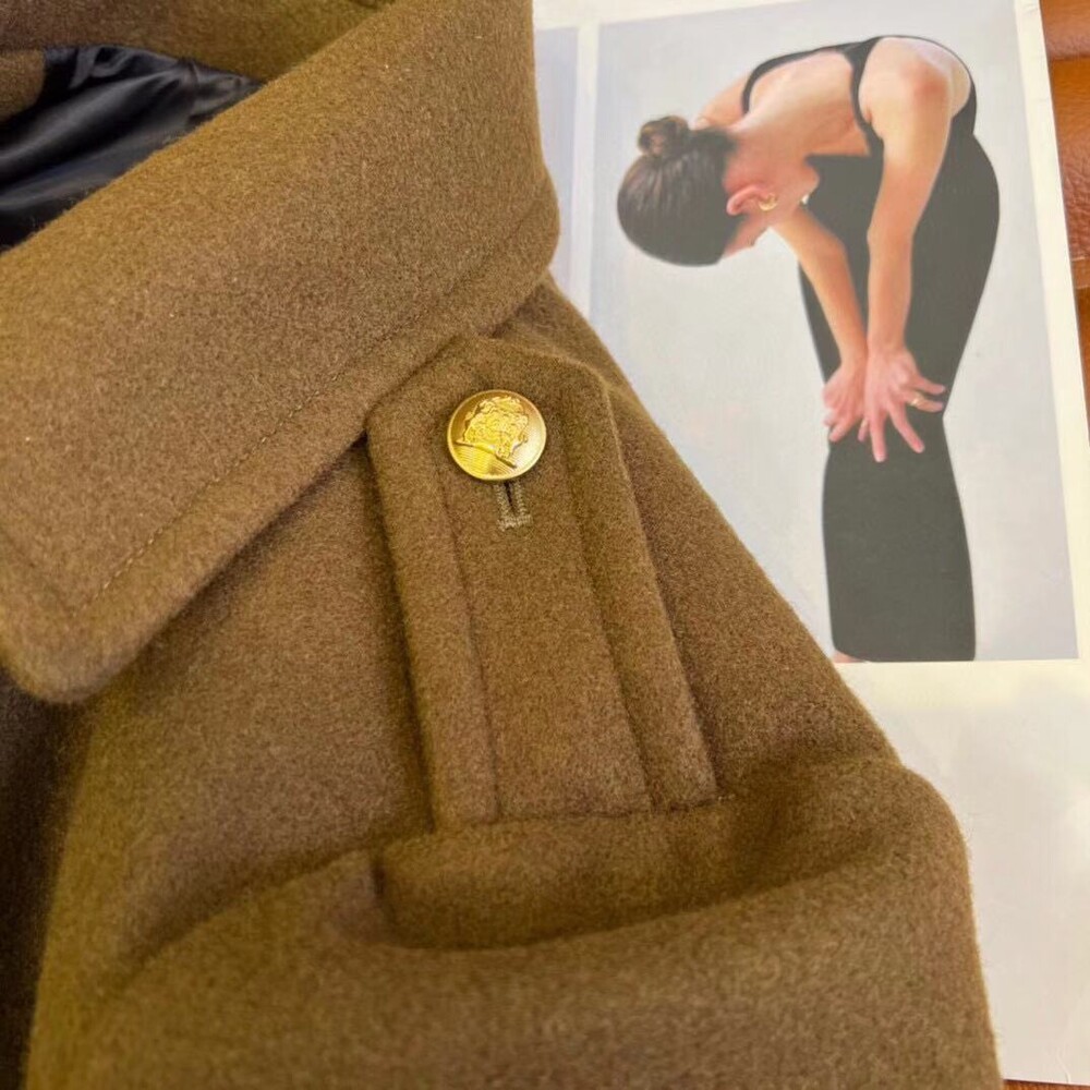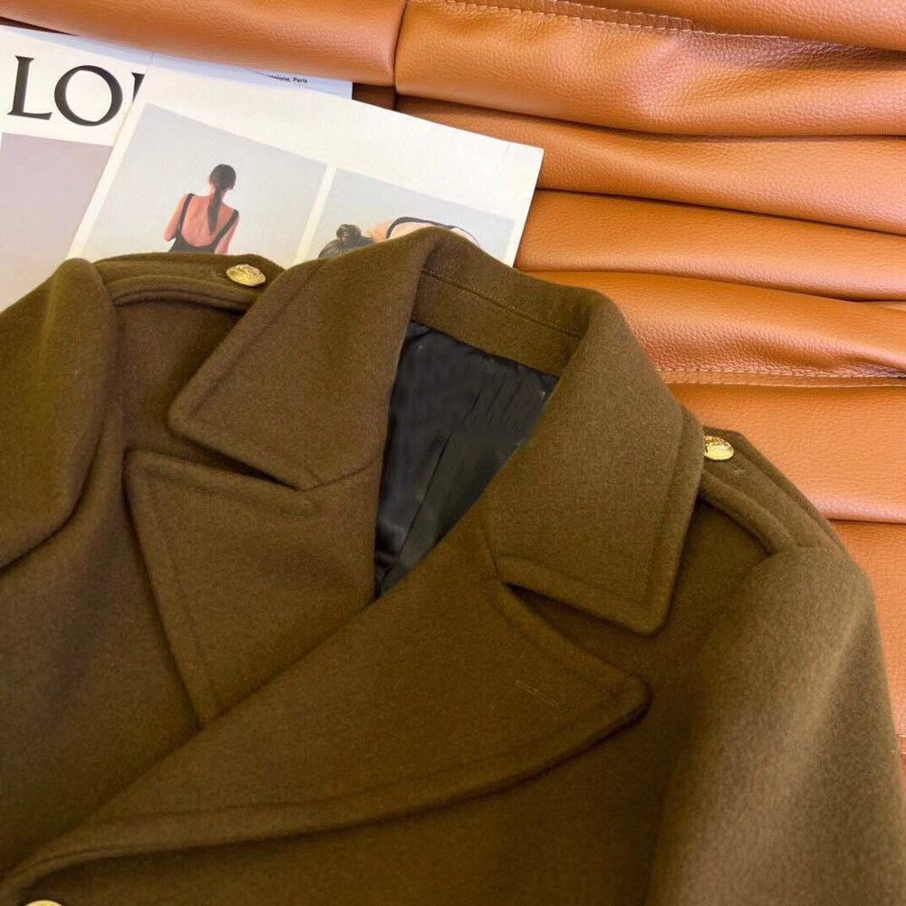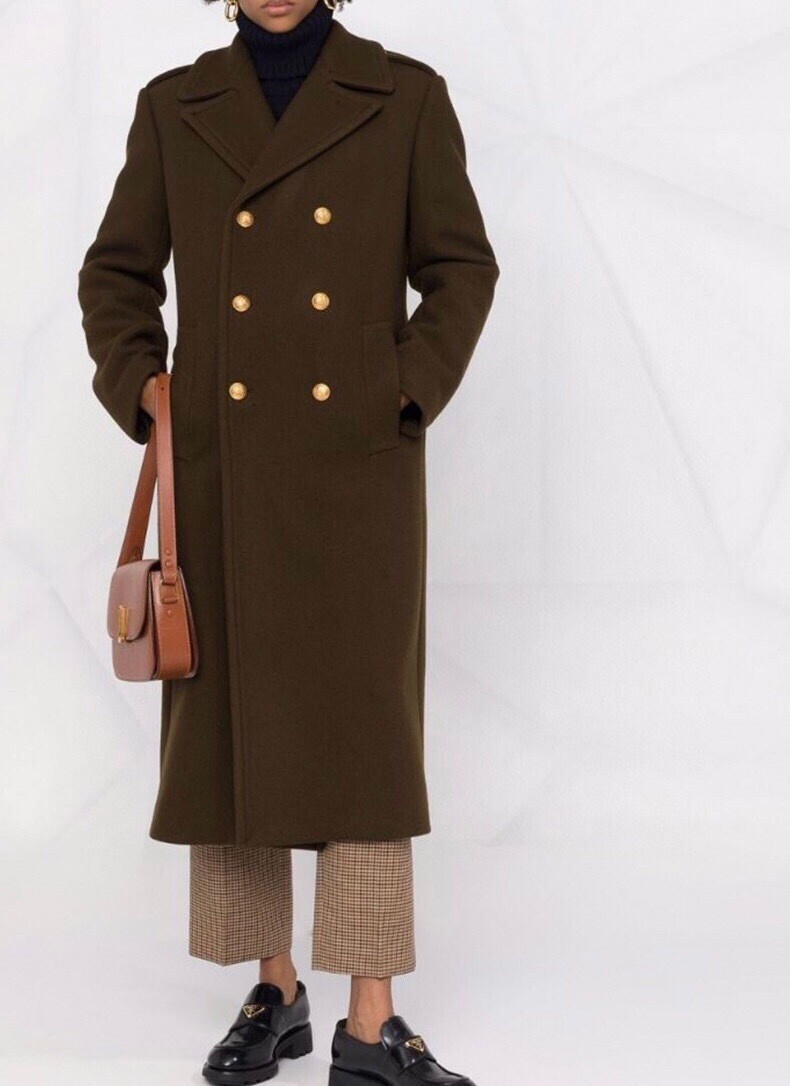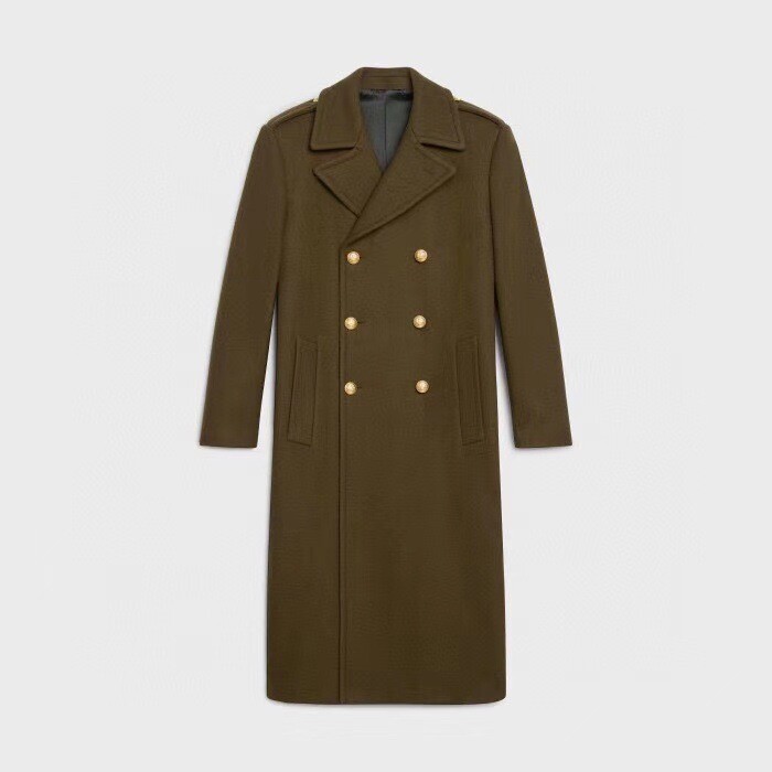 오버핏한 핏감의 아미그린 색상의 롱코트입니다