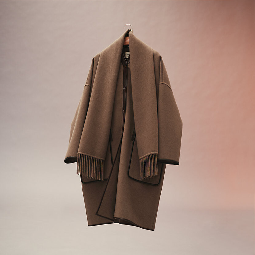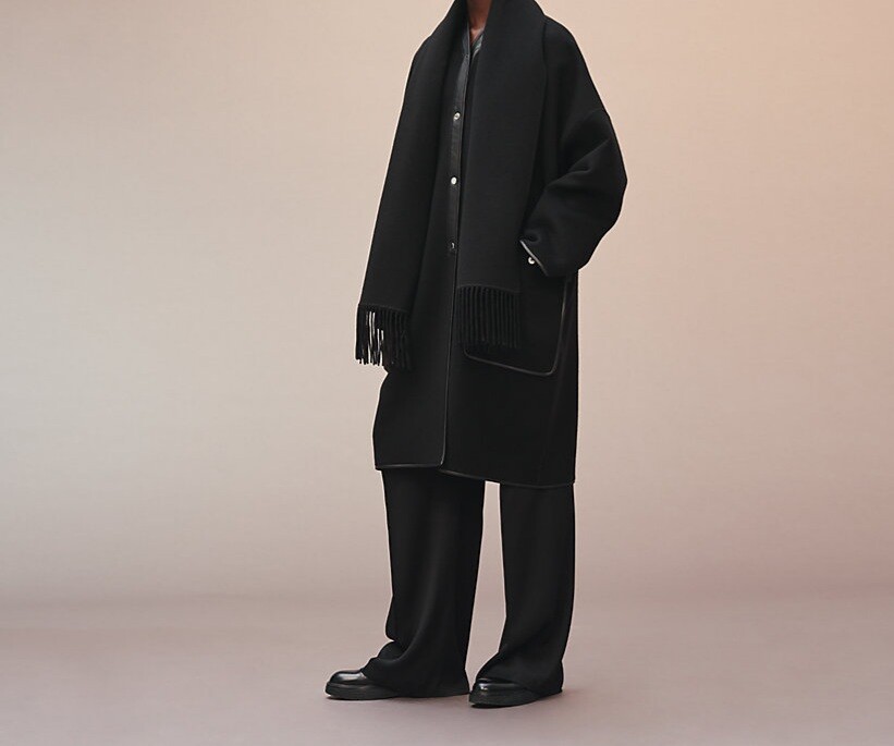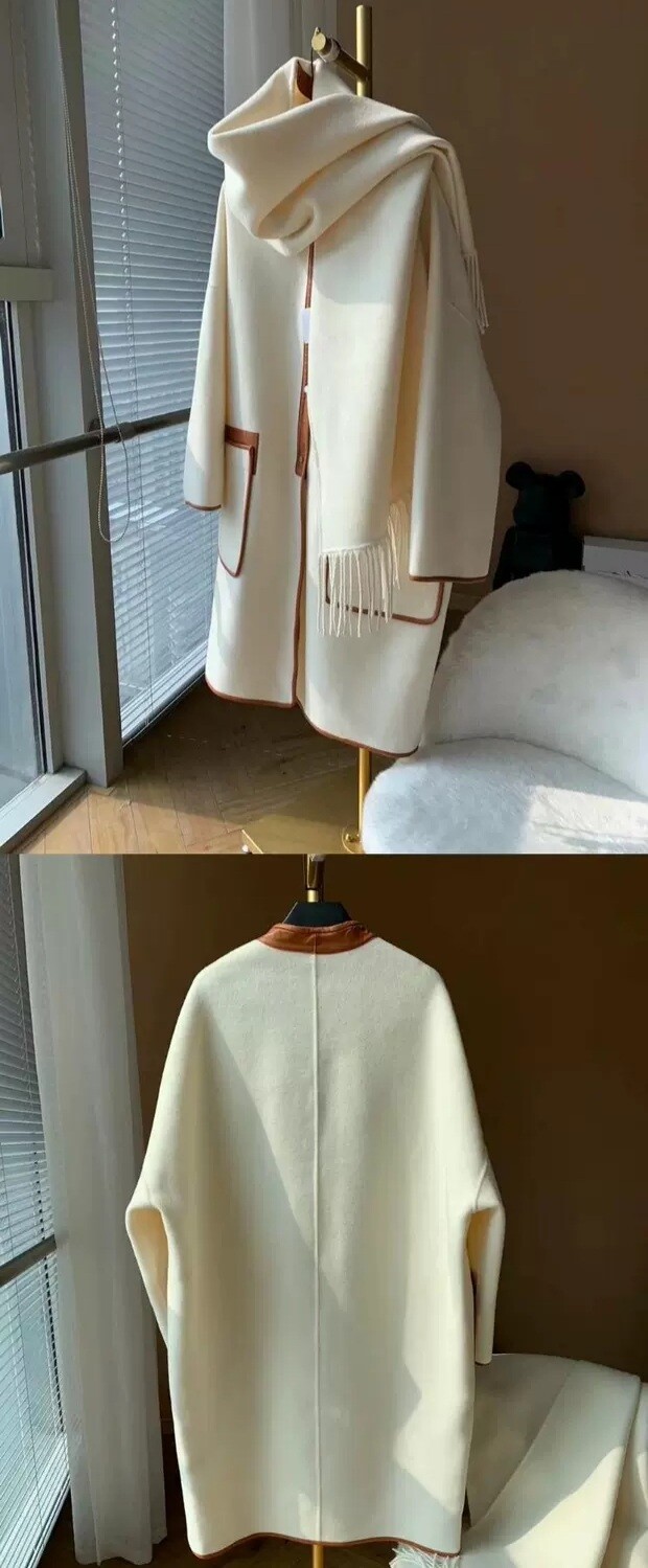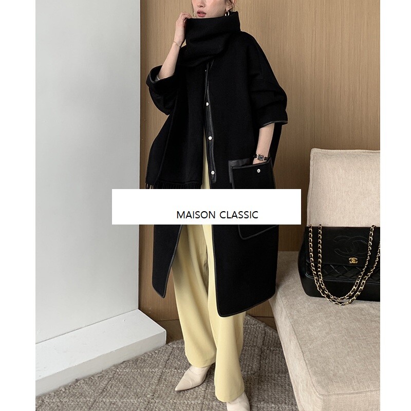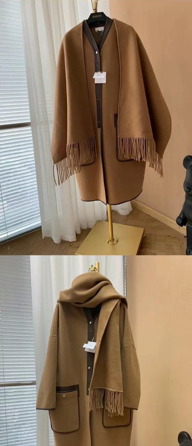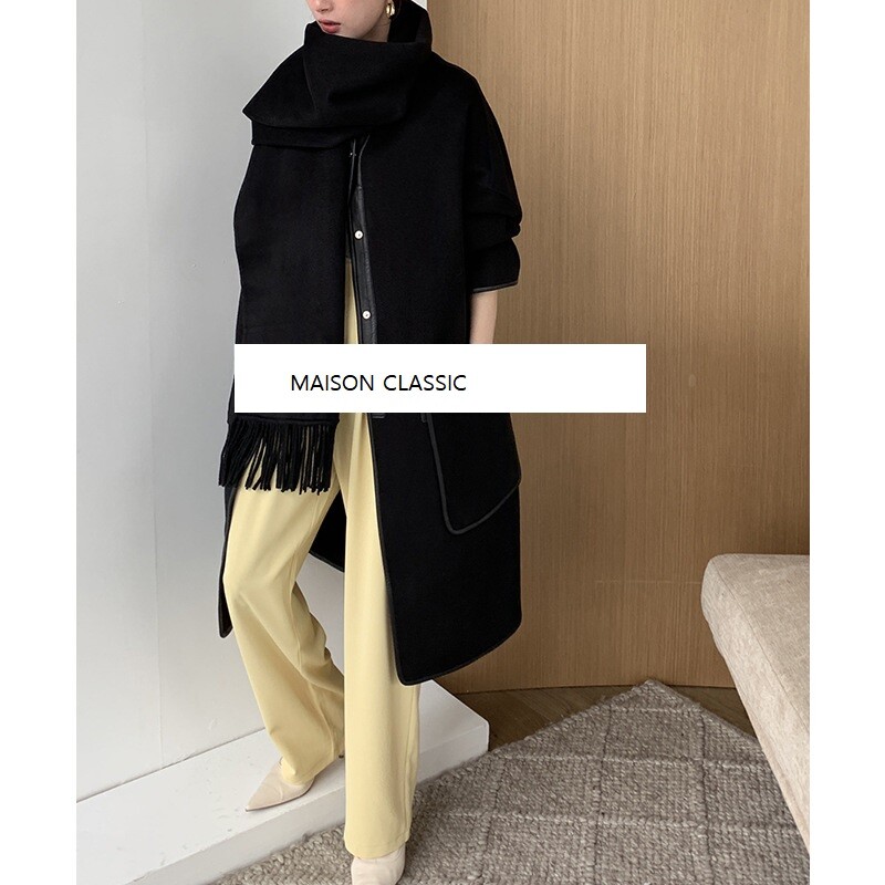 탈부착 가능한 프린지 스카프가 장식된 더블사이드 캐시미어 소재의