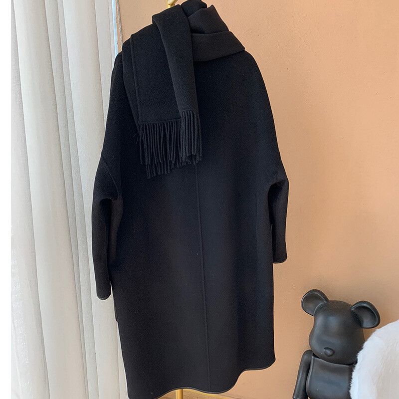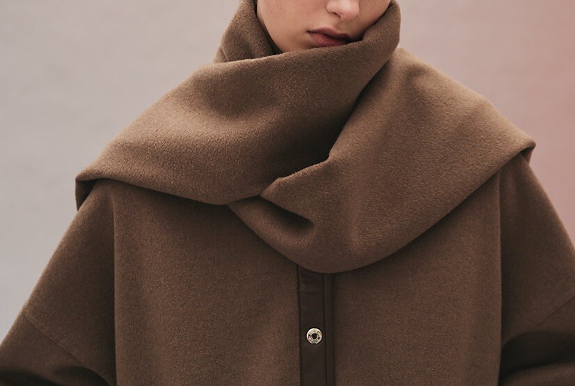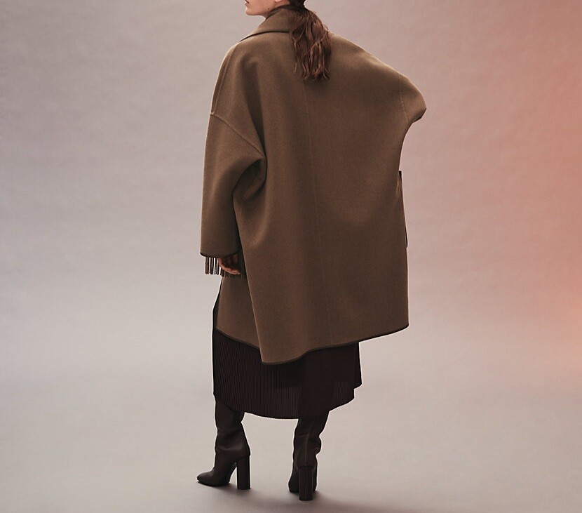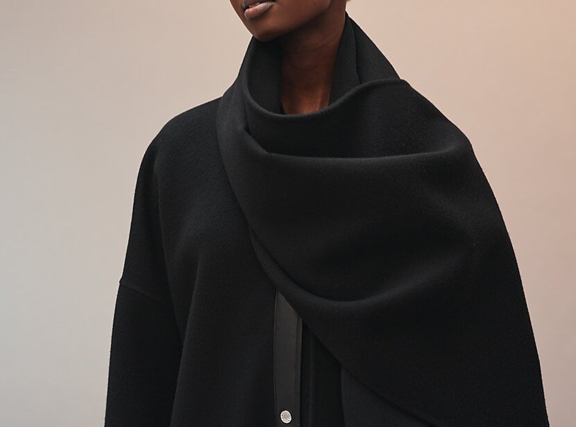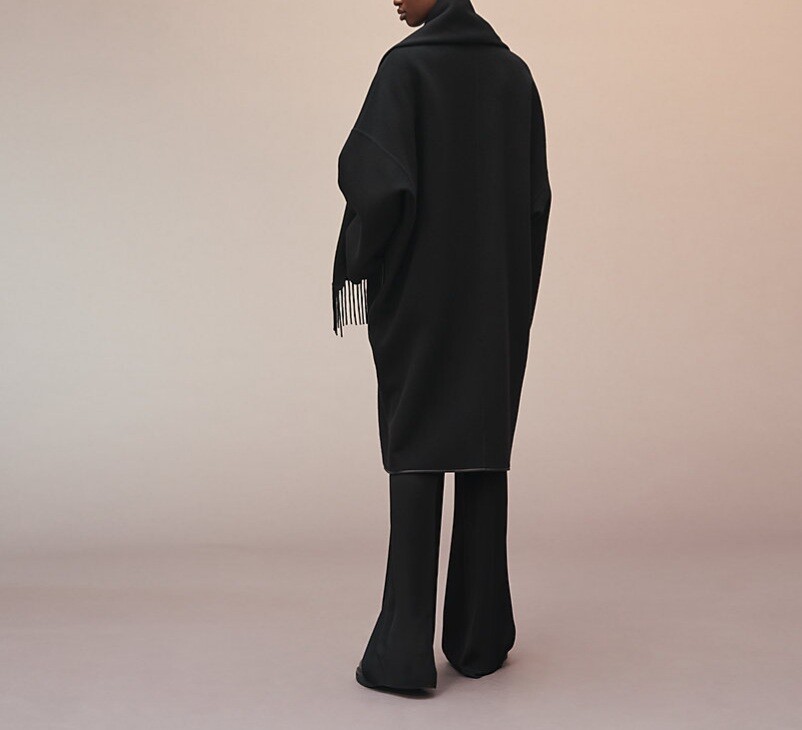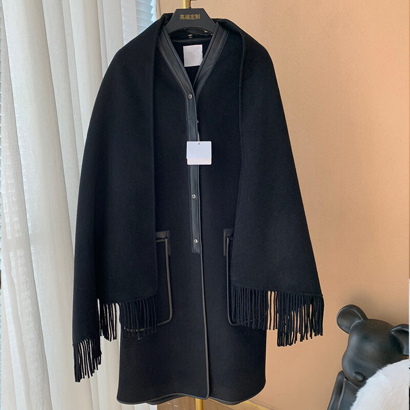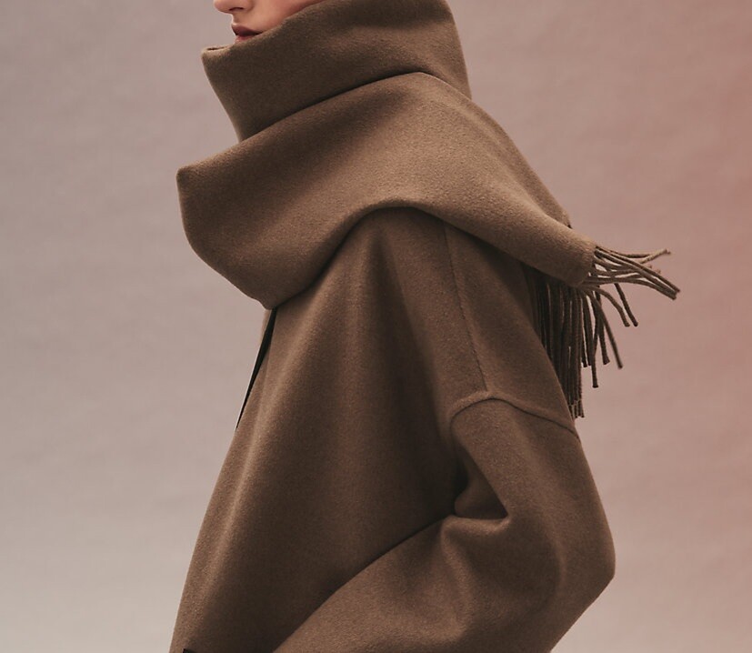 탈부착 가능한 프린지 스카프가 장식된 더블사이드 캐시미어 소재의