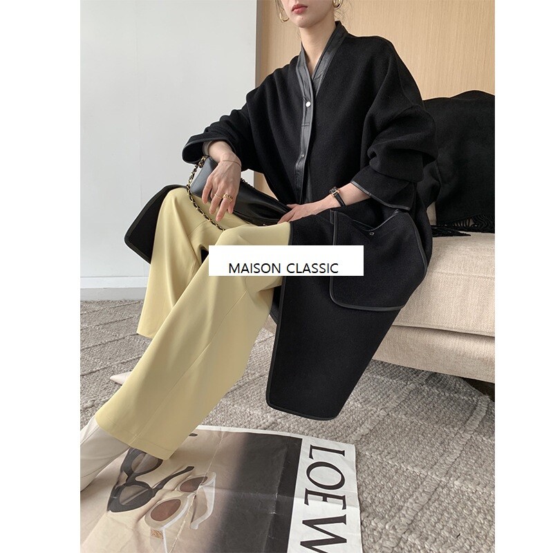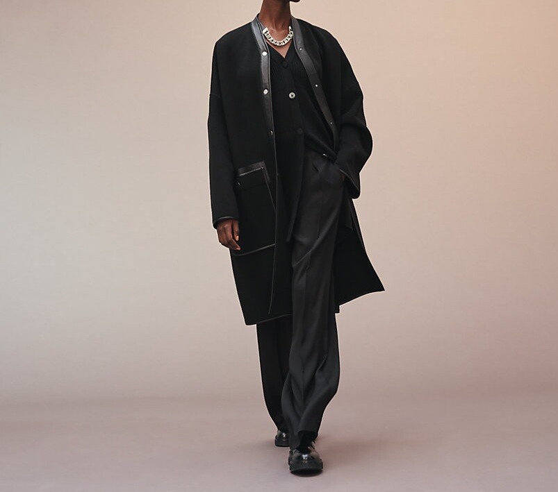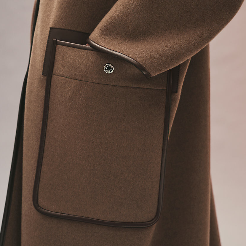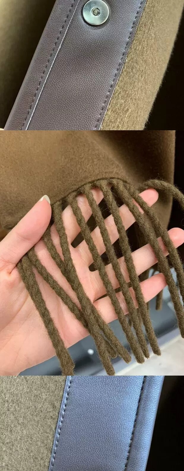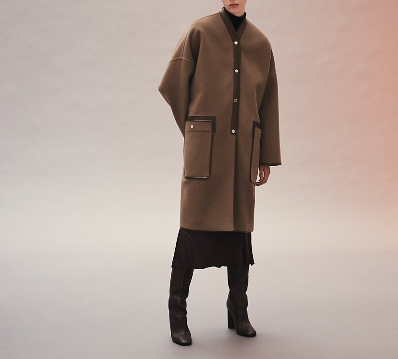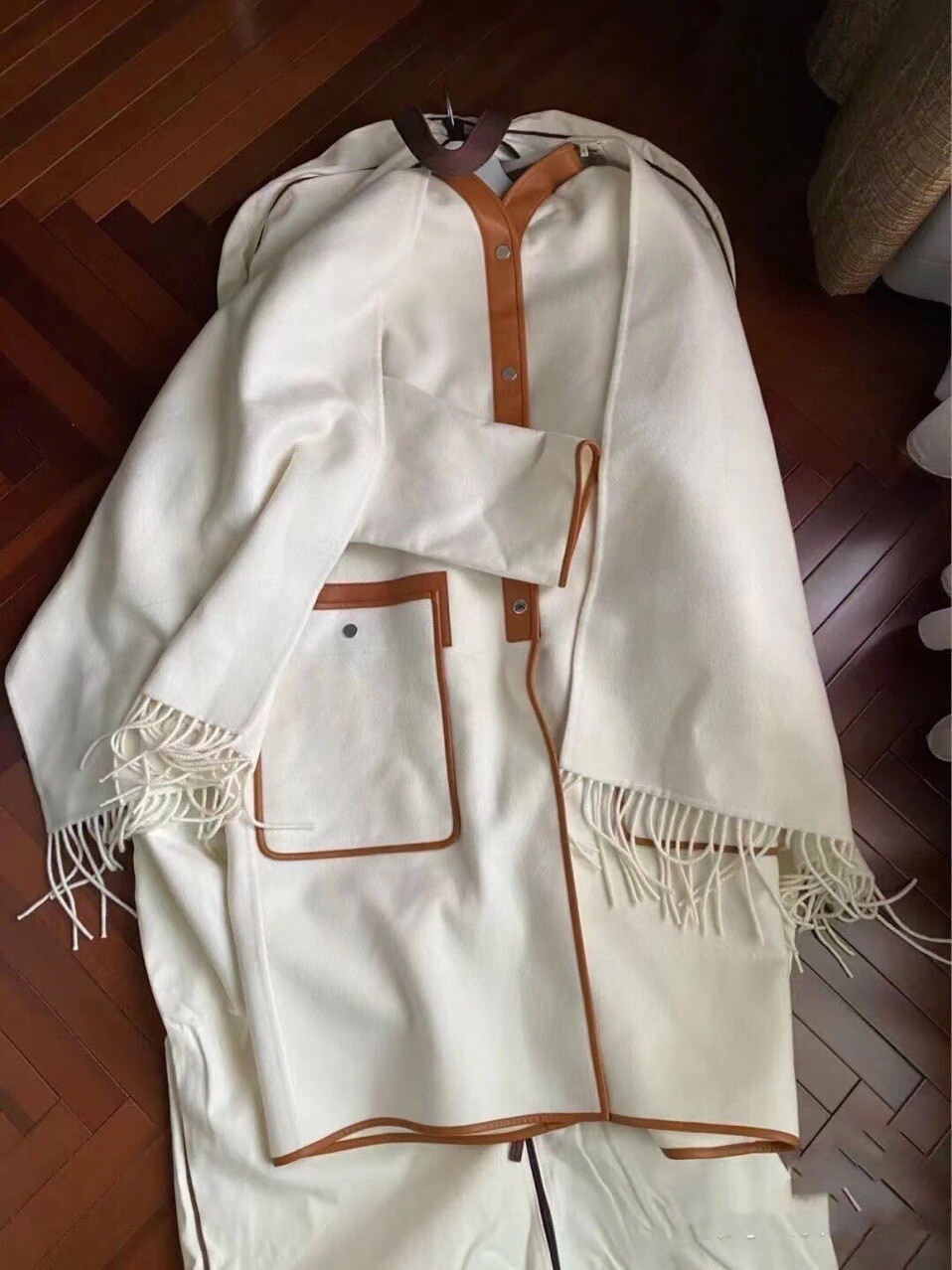 탈부착 가능한 프린지 스카프가 장식된 더블사이드 캐시미어 소재의