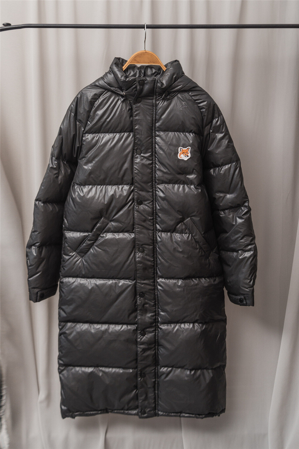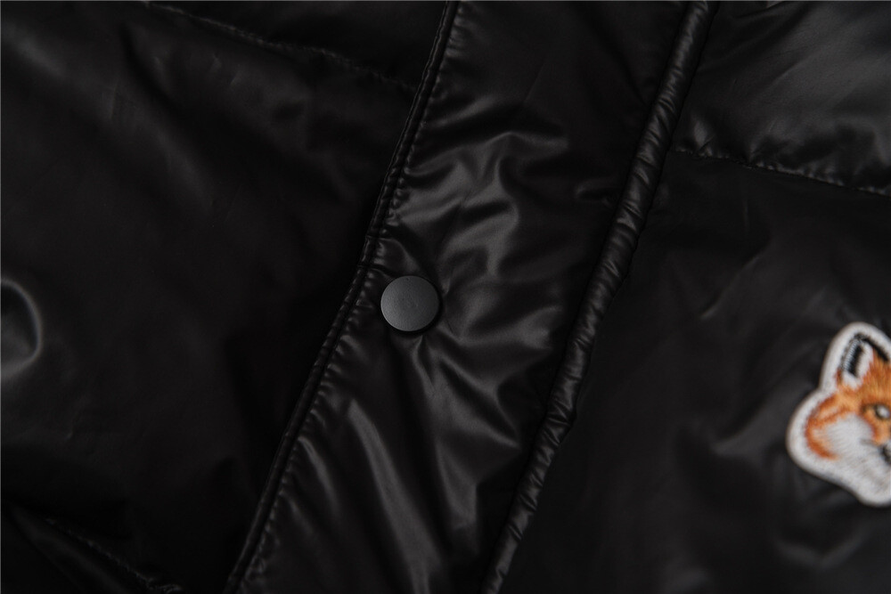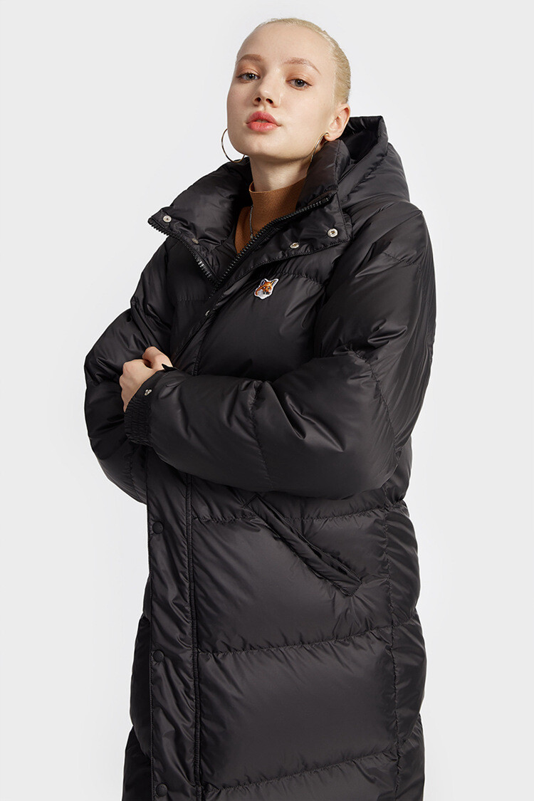 키츠네 패치가 있는 화이트덕다운의 롱패딩입니다