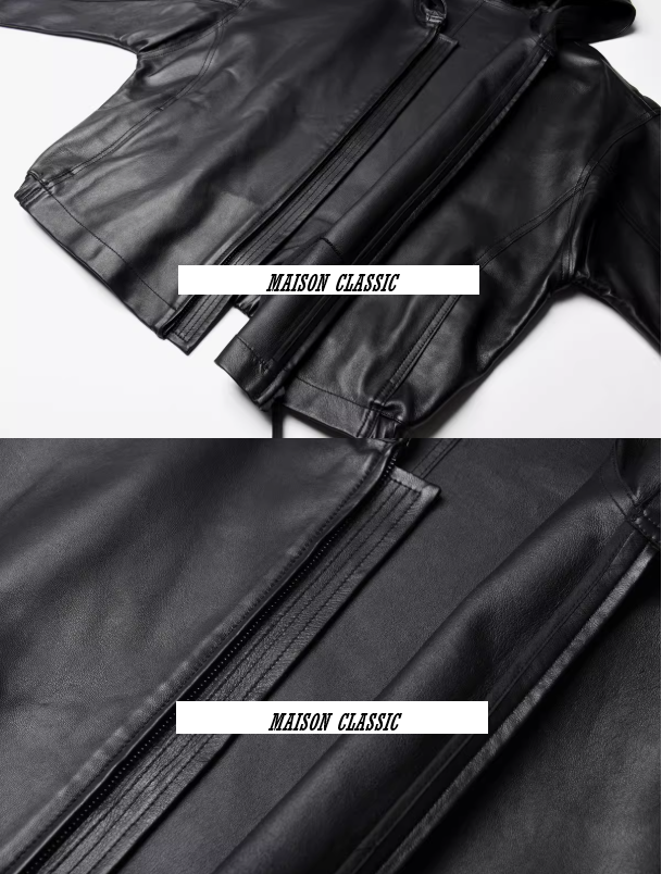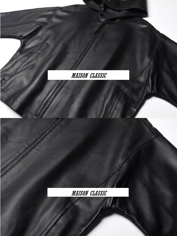 스페인산 수입 양가죽으로 제작되어 섬세하고 부드러운 질감, 따뜻한 광택, 은은한 향을 자랑하며, 고급스러움을 물씬 풍깁니다.가죽 앞면은 코팅 처리가 되어 있지 않아 매끄러운 촉감을 선사합니다. 뒷면은 0.4cm 두께로 얇게 가공한 후 샌딩 및 클로즈드 플록 처리를 하여 안감 없이 가볍고 스타일리시한 디자인을 완성했습니다.최근 유행하는 '세컨드 스킨' 가죽 처리 기술은 실제 피부와 같은 감촉을 제공하며, 현재 극소수의 최고급 브랜드와 소규모 독립 디자이너 브랜드에서만 사용되고 있습니다.전체 가죽을 레이저 커팅하여 깔끔한 마감을 구현했지만, 재료 낭비가 상당합니다. 넉넉한 핏과 후드 디자인까지 더해져 재료 사용량이 많아지면서 가격이 눈에 띄게 높아졌습니다.초박형 가죽 직조는 특수 작업대와 맞춤 제작 도구를 필요로 하는 정교하고 시간 소모적인 공정입니다. 대부분의 작업은 20년 경력의 장인이 수작업으로 진행하며, 하루에 최대 한 벌만 완성할 수 있습니다. 넉넉한드롭 숄더 후드 디자인은 스타일리시하면서도 캐주얼한 룩을 연출하여 모든 체형에 잘 어울리고 편안하면서도 자연스러운 느낌을 선사합니다.