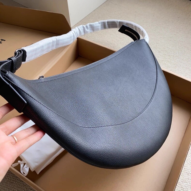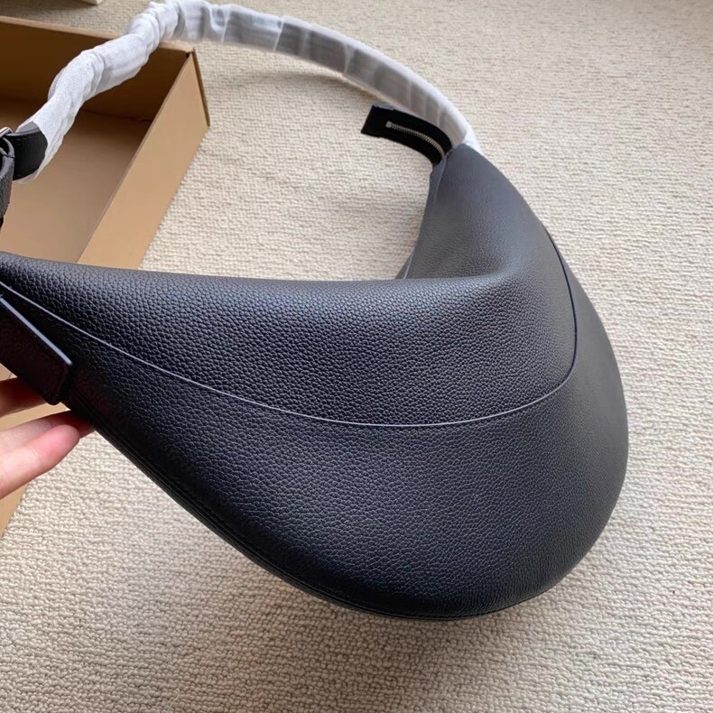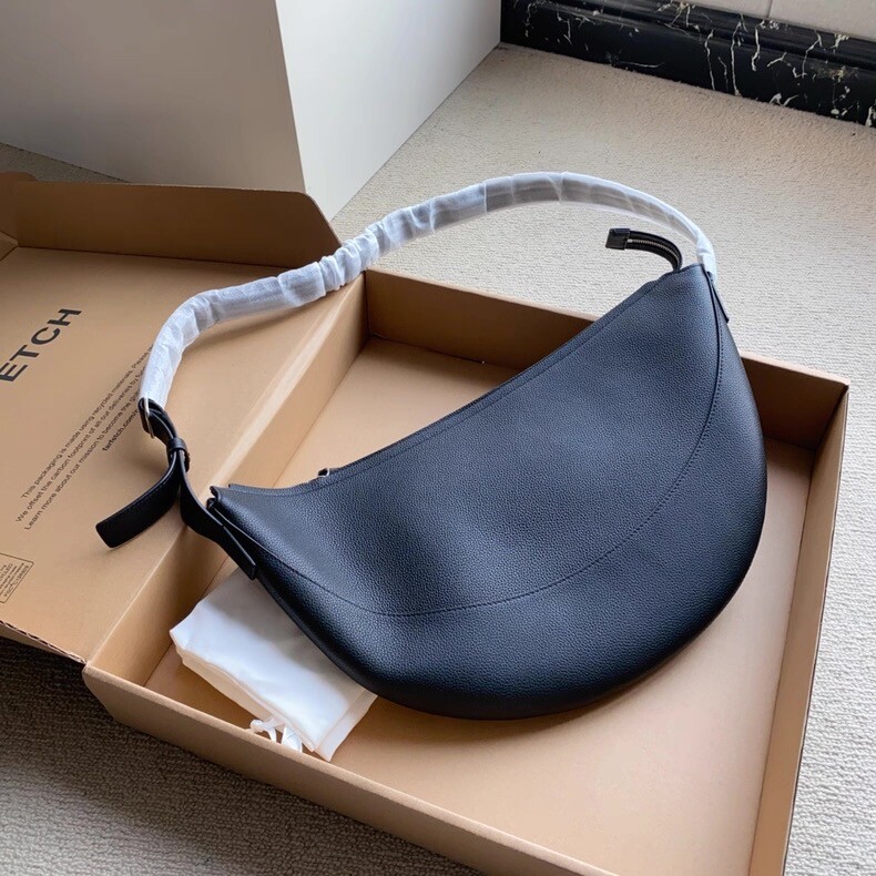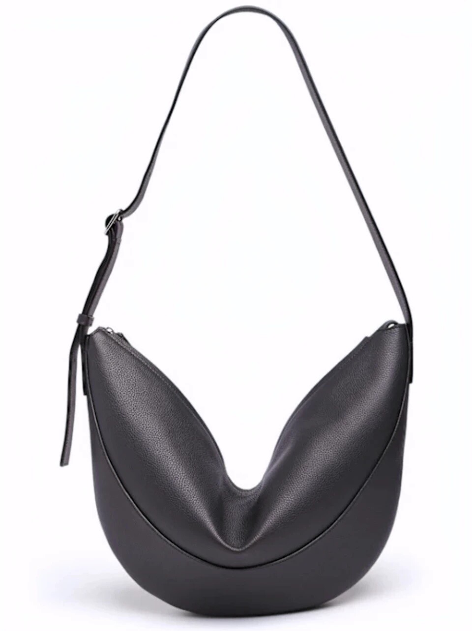 초승달 모양 디자인, 지퍼 잠금 장치, 작은 측면 로고 글자, 금속 버클이 달린 조절 가능한 숄더 스트랩이 특징입니다.