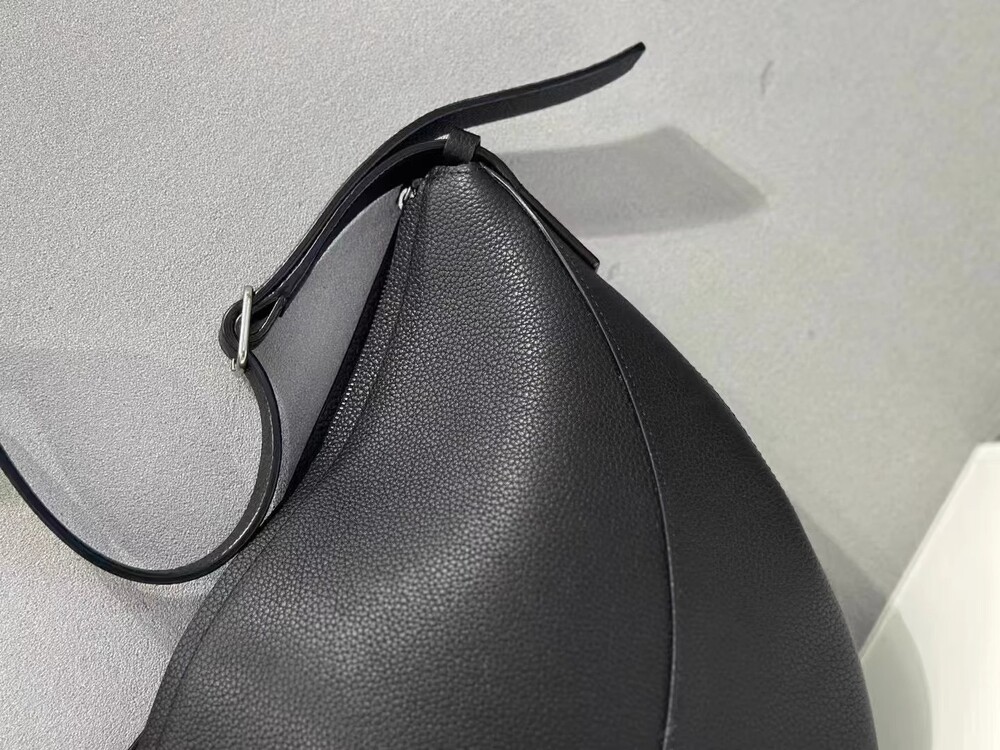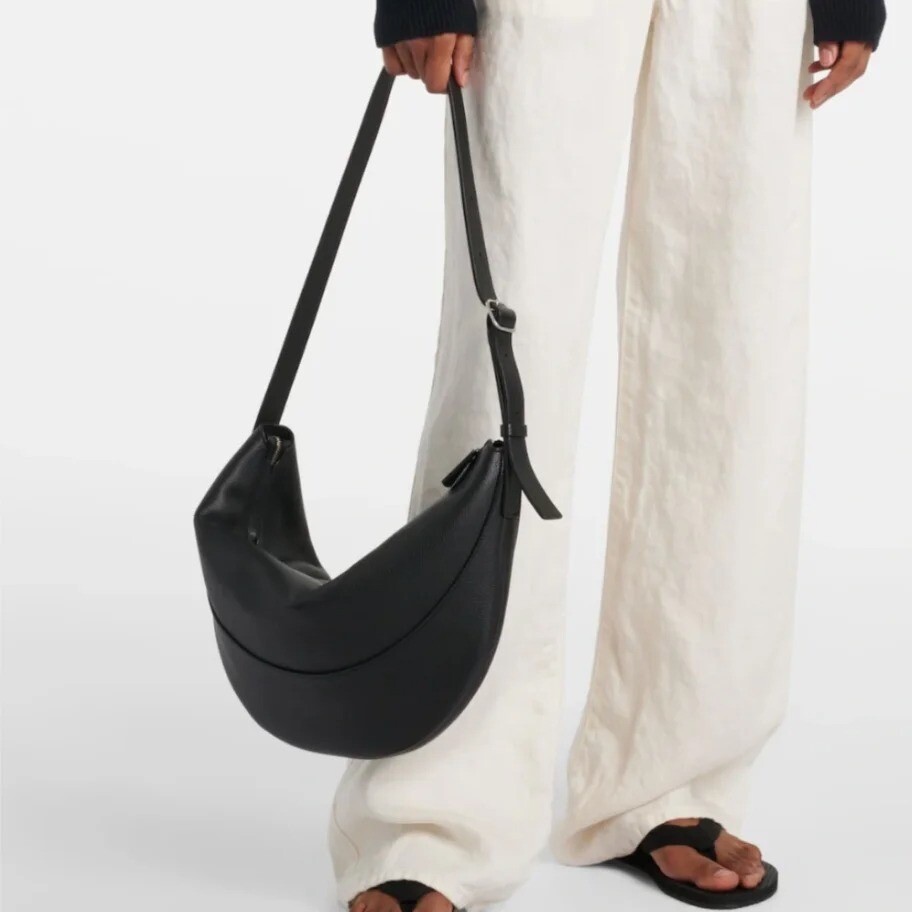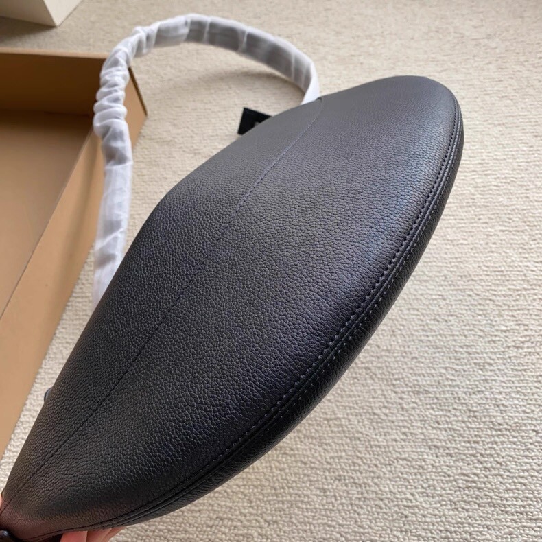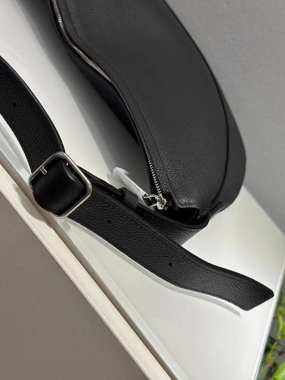초승달 모양 디자인, 지퍼 잠금 장치, 작은 측면 로고 글자, 금속 버클이 달린 조절 가능한 숄더 스트랩이 특징입니다.