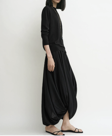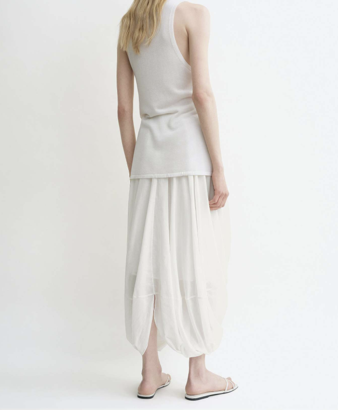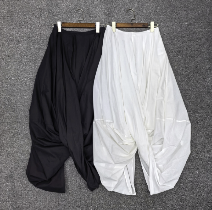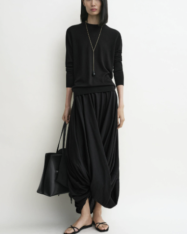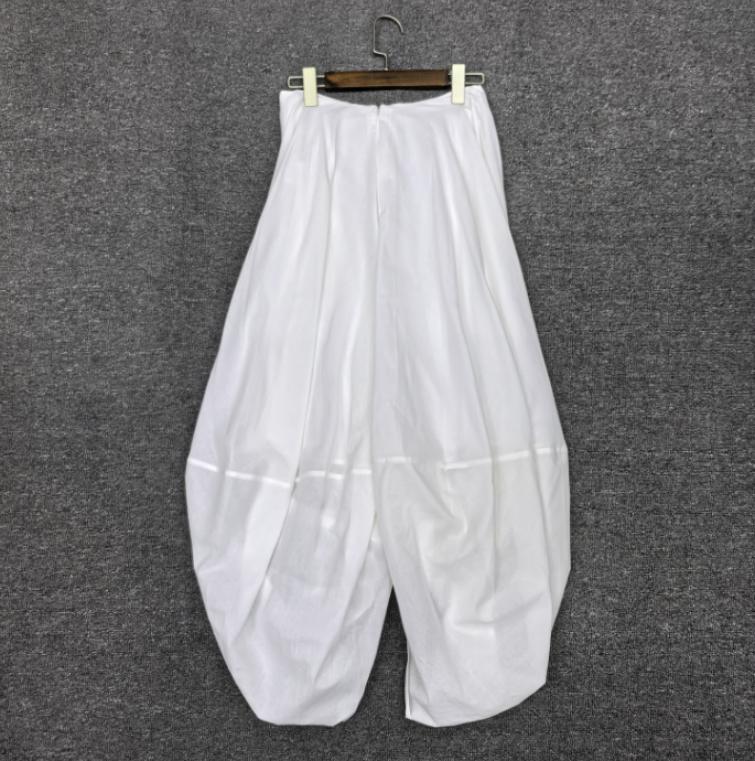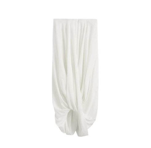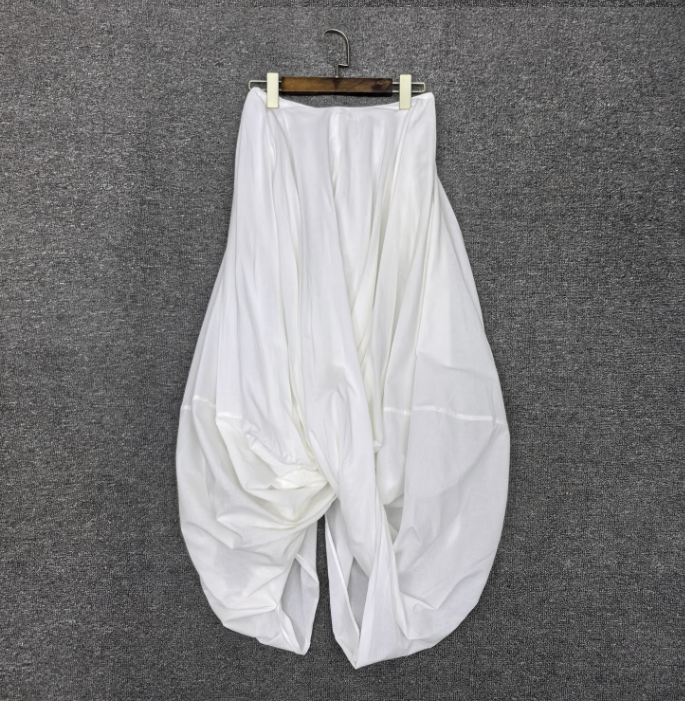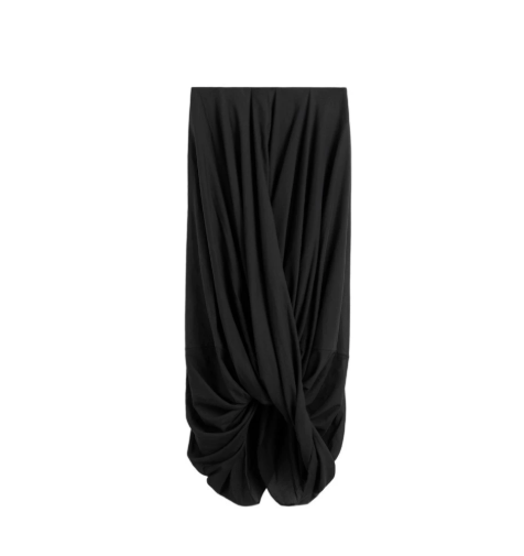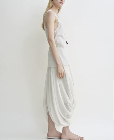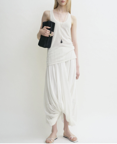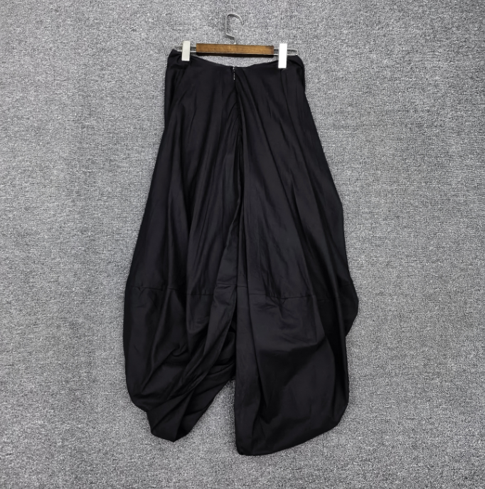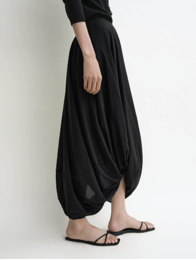 끝단이 볼륨이포인트로 처리된 비대칭 스커트로