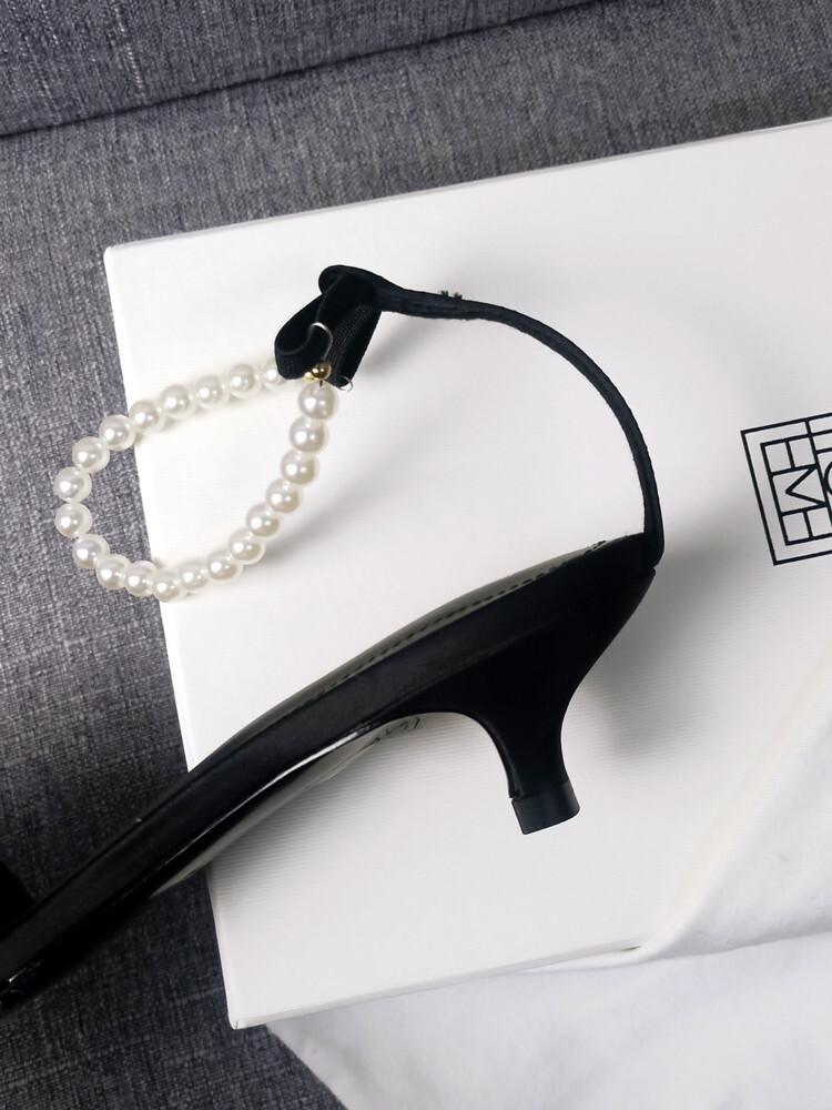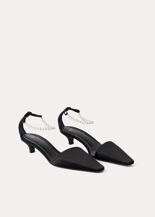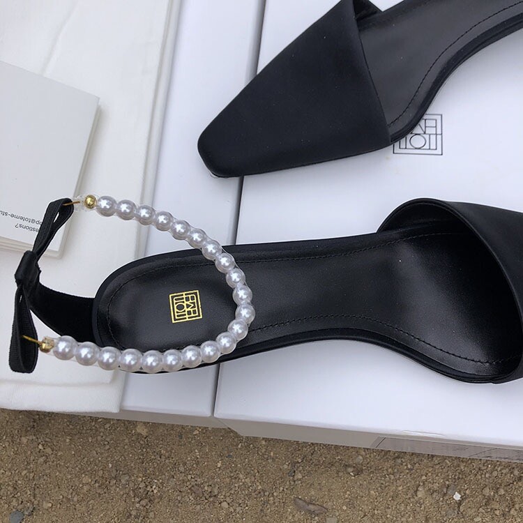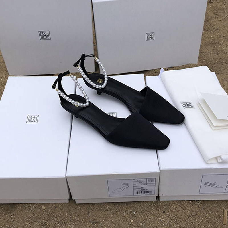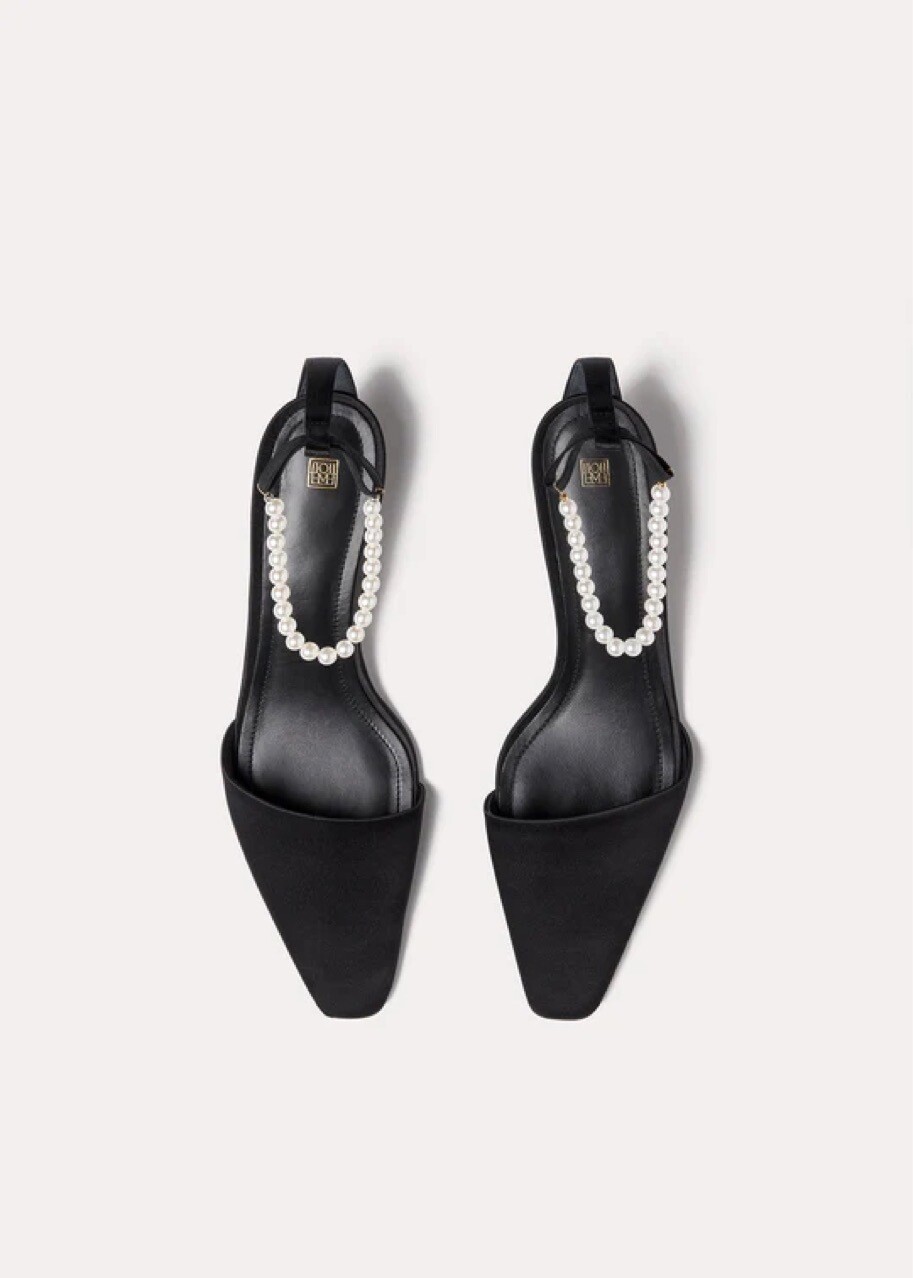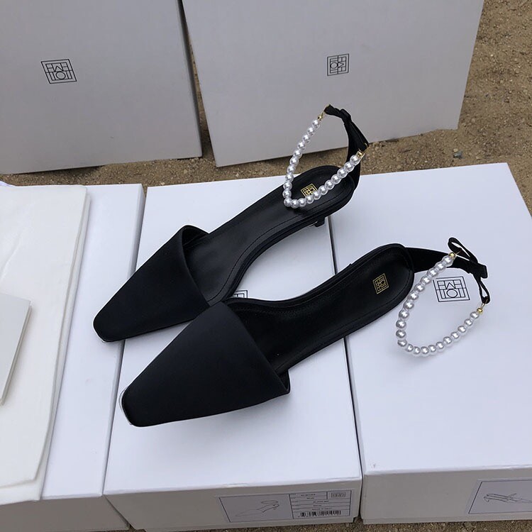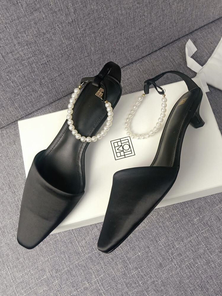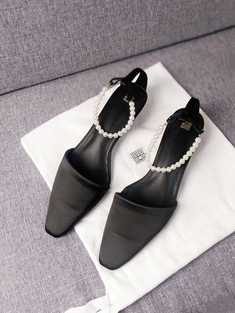 포인트 토 디자인의 부드러운 새틴 소재로 제작되었습니다. 발목 스트랩은 인조 진주로 섬세하게 장식되어 있습니다.