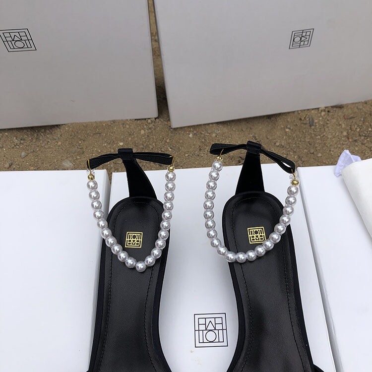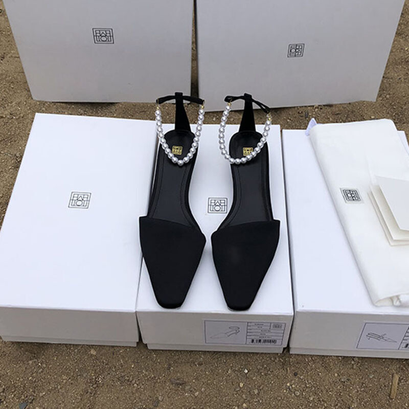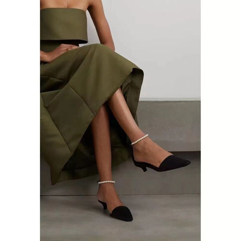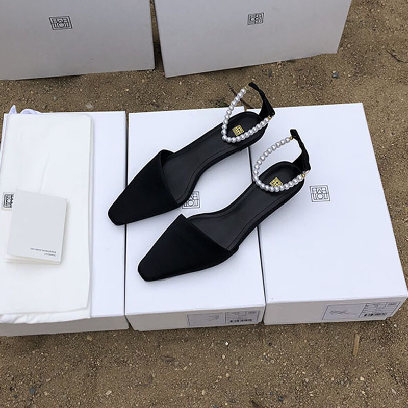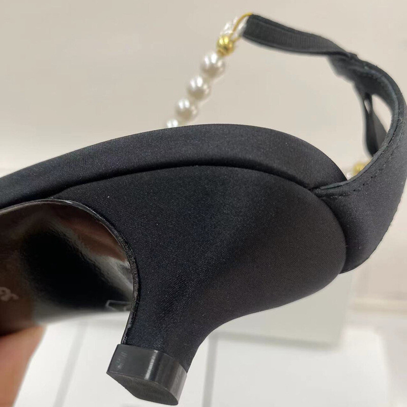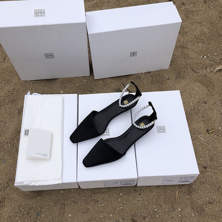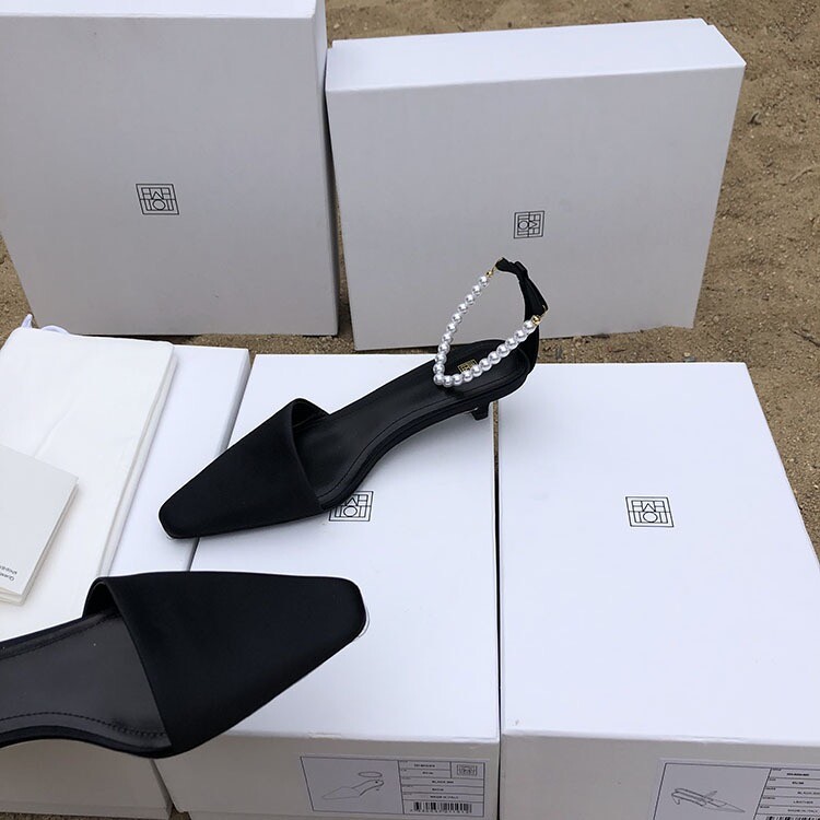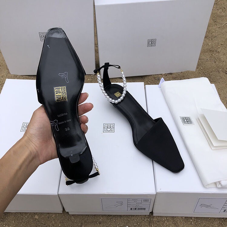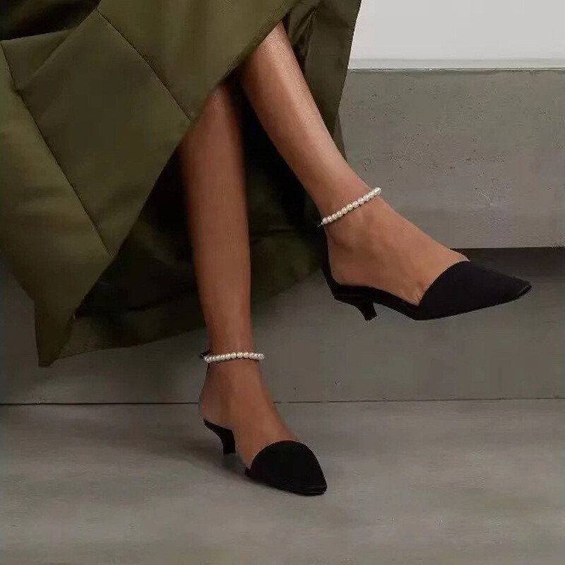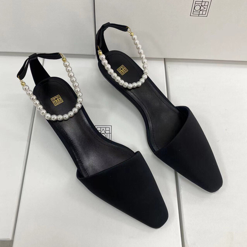포인트 토 디자인의 부드러운 새틴 소재로 제작되었습니다. 발목 스트랩은 인조 진주로 섬세하게 장식되어 있습니다.