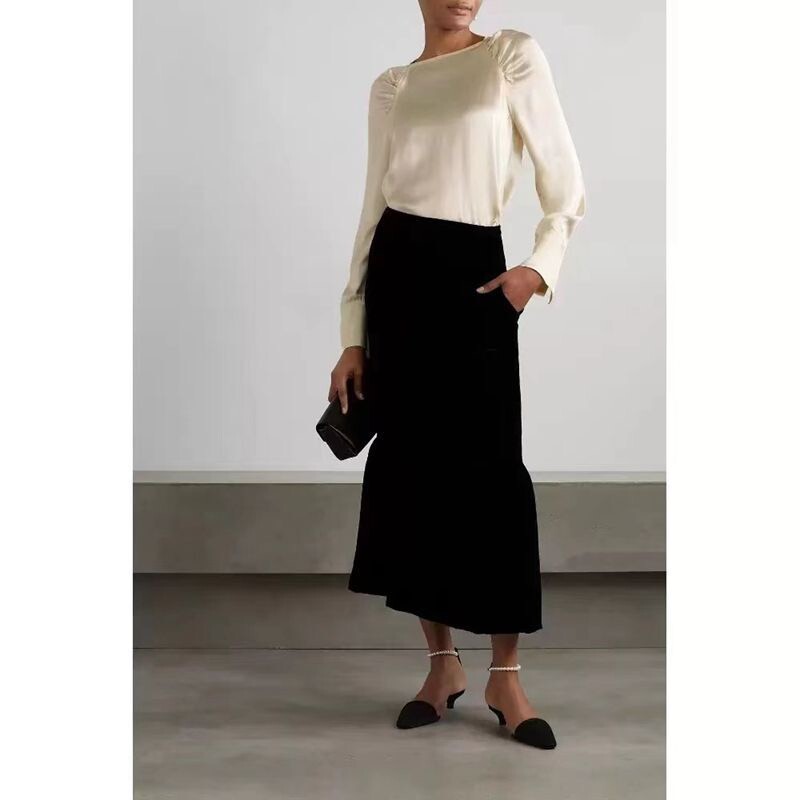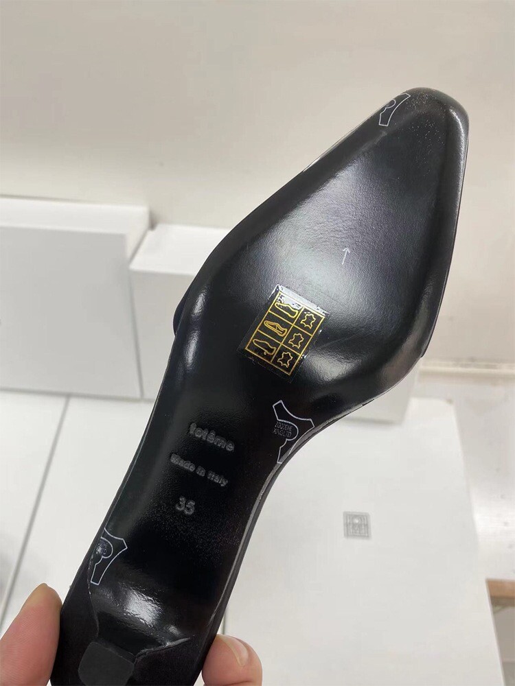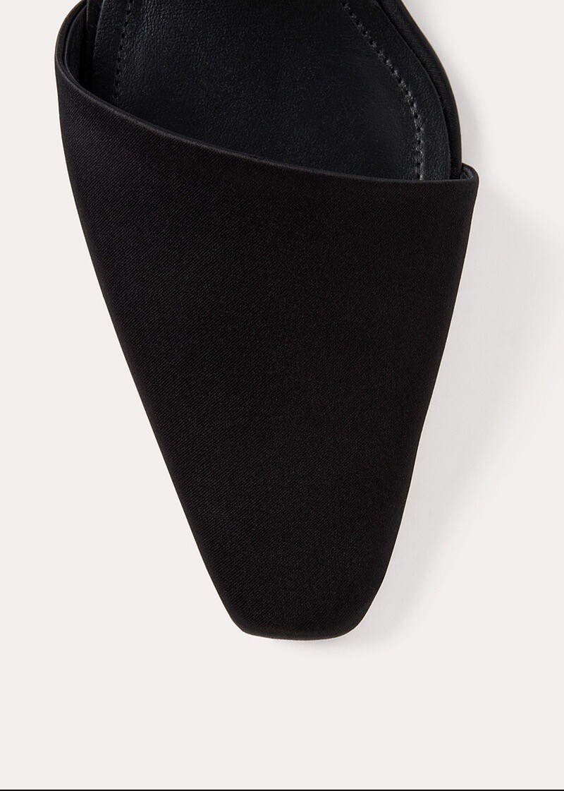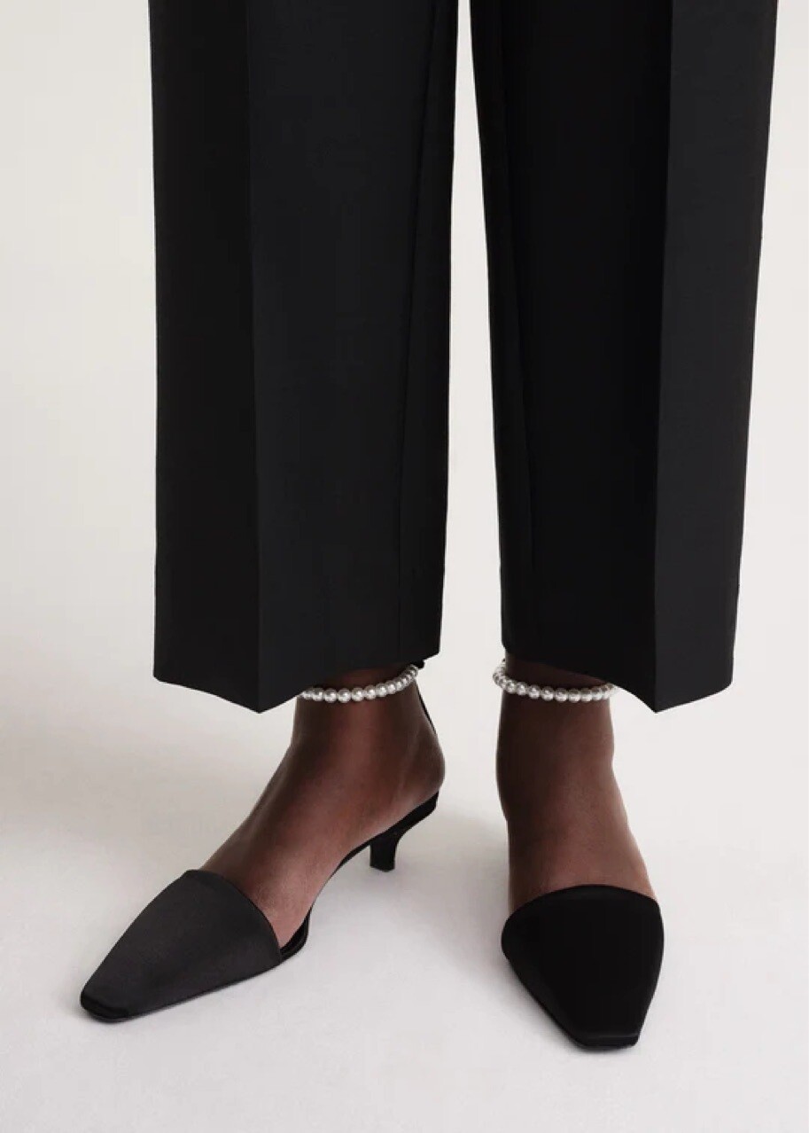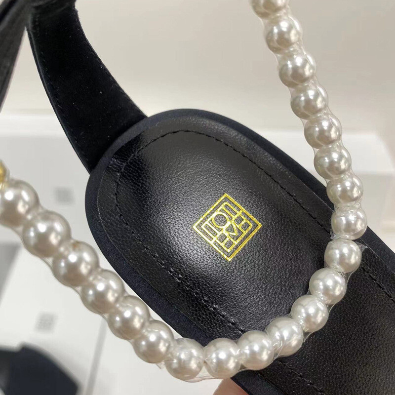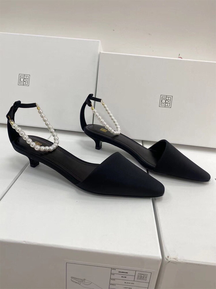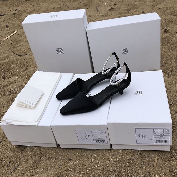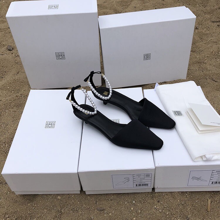 포인트 토 디자인의 부드러운 새틴 소재로 제작되었습니다. 발목 스트랩은 인조 진주로 섬세하게 장식되어 있습니다.