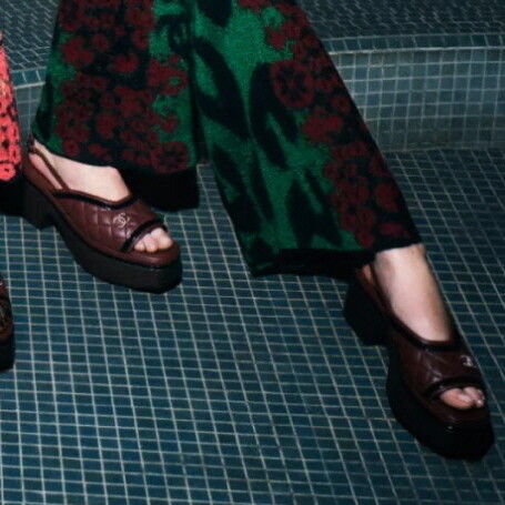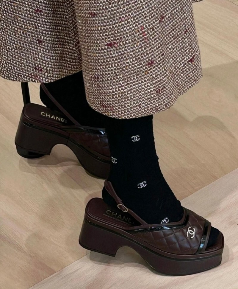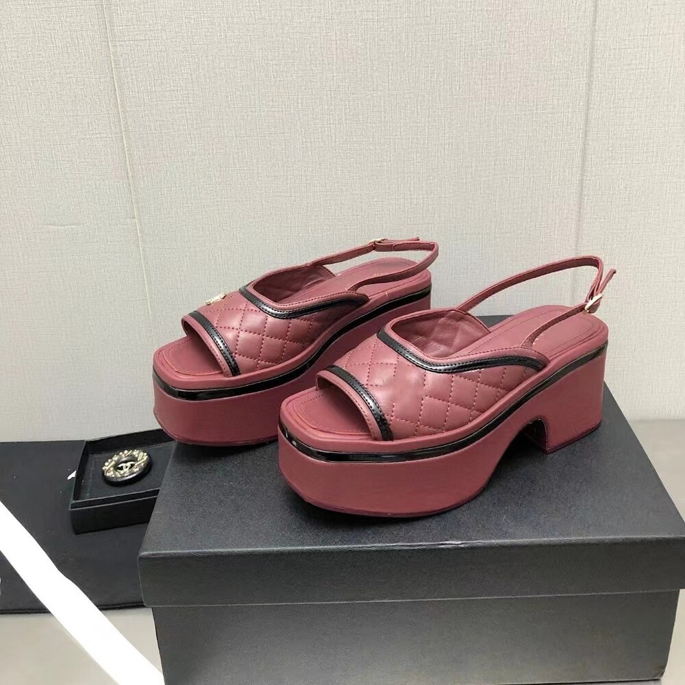 CC 로고가 들어간 버건디 플랫폼 샌들입니다
